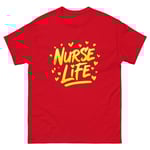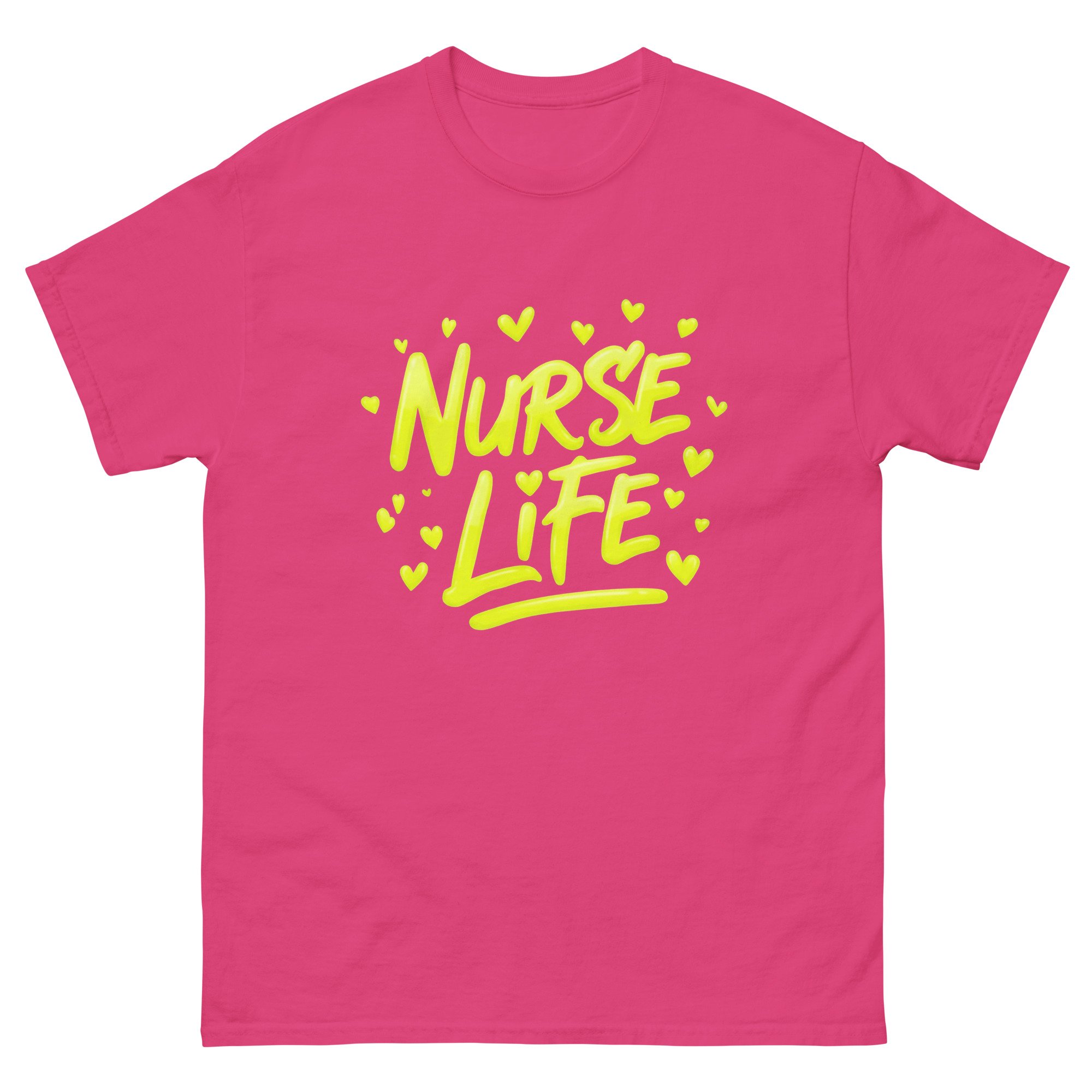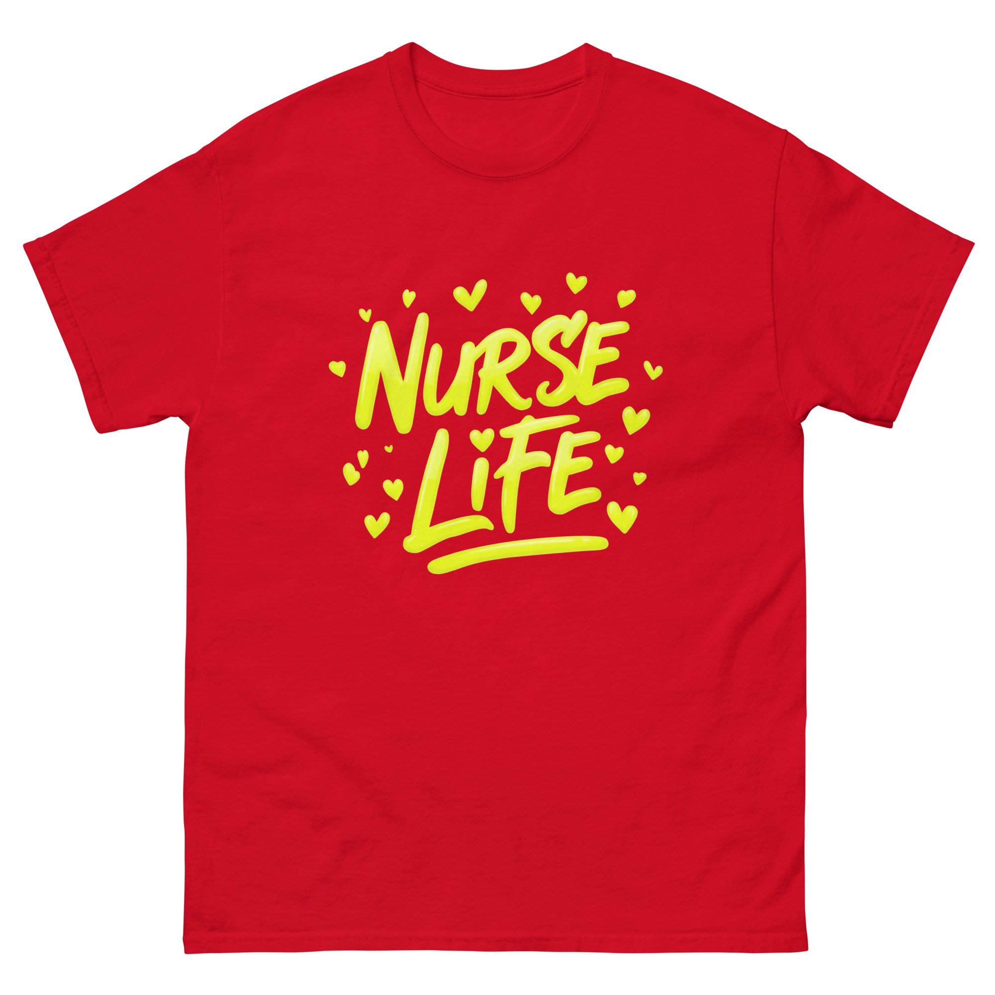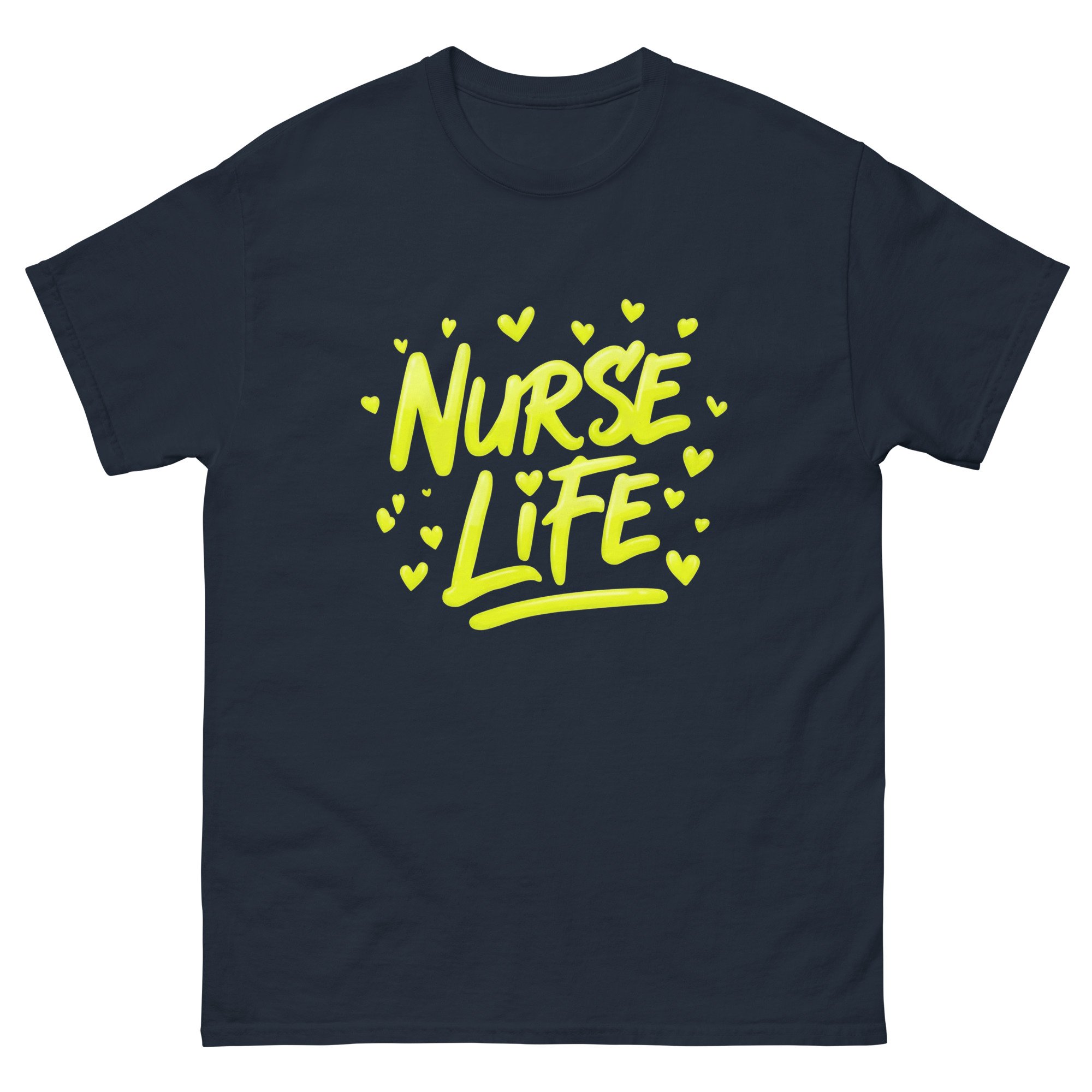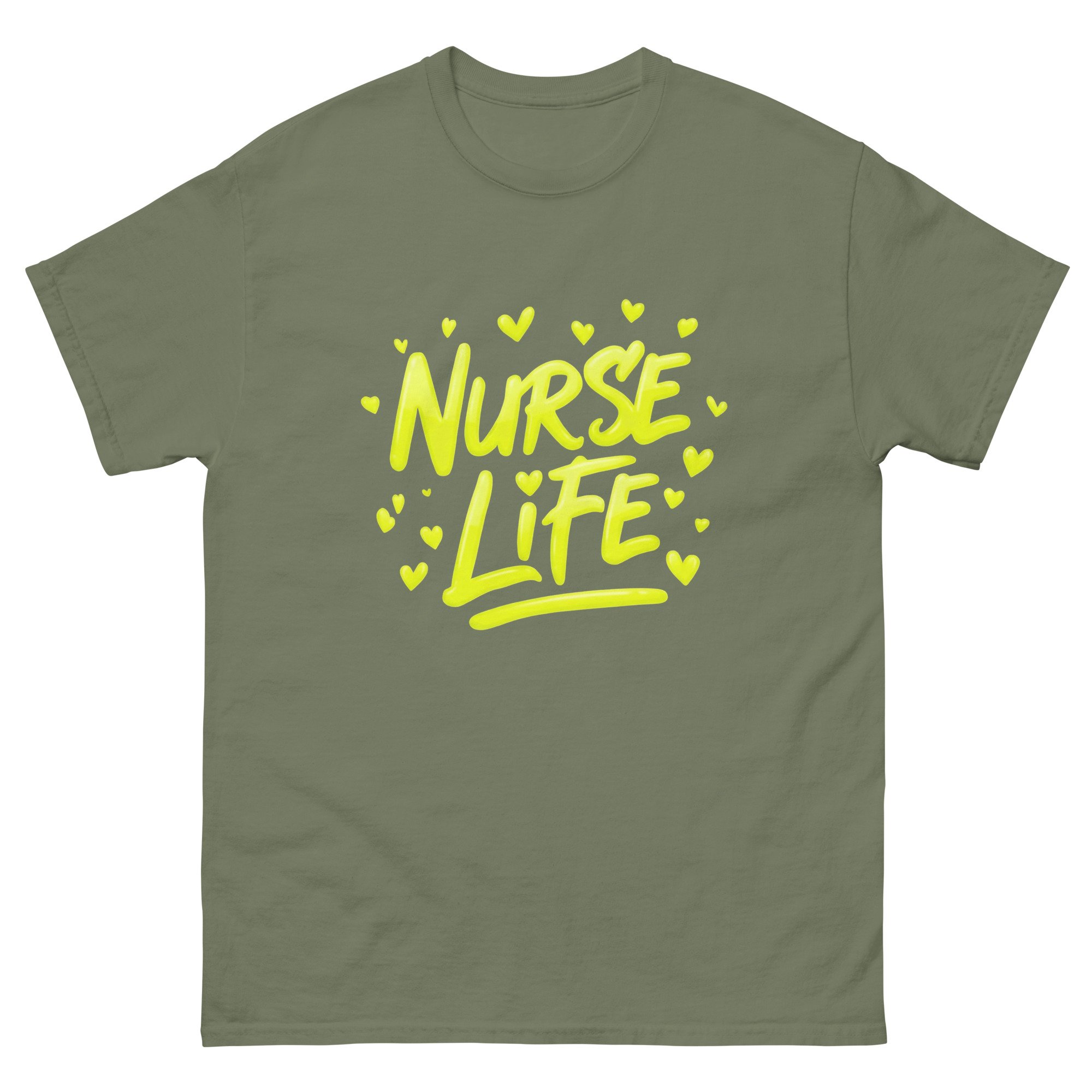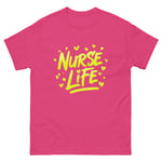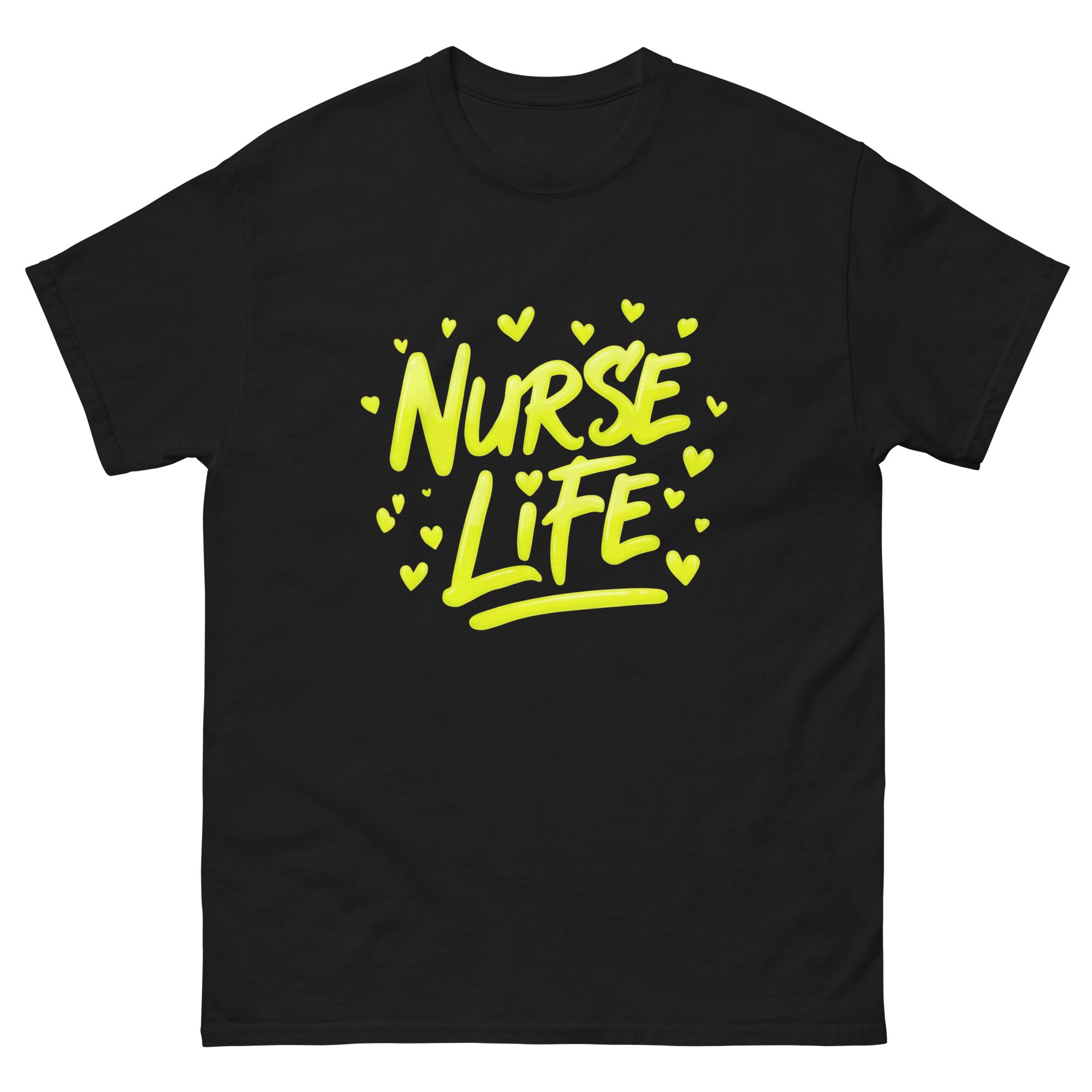 This Nurse Life shirt features bold yellow graffiti-style lettering with expressive paint stroke detail and heart accents, capturing the energy, dedication, and passion behind the nursing profession. The bright, high-contrast design gives this graphic tee a modern artistic edge while proudly celebrating the nurse life.