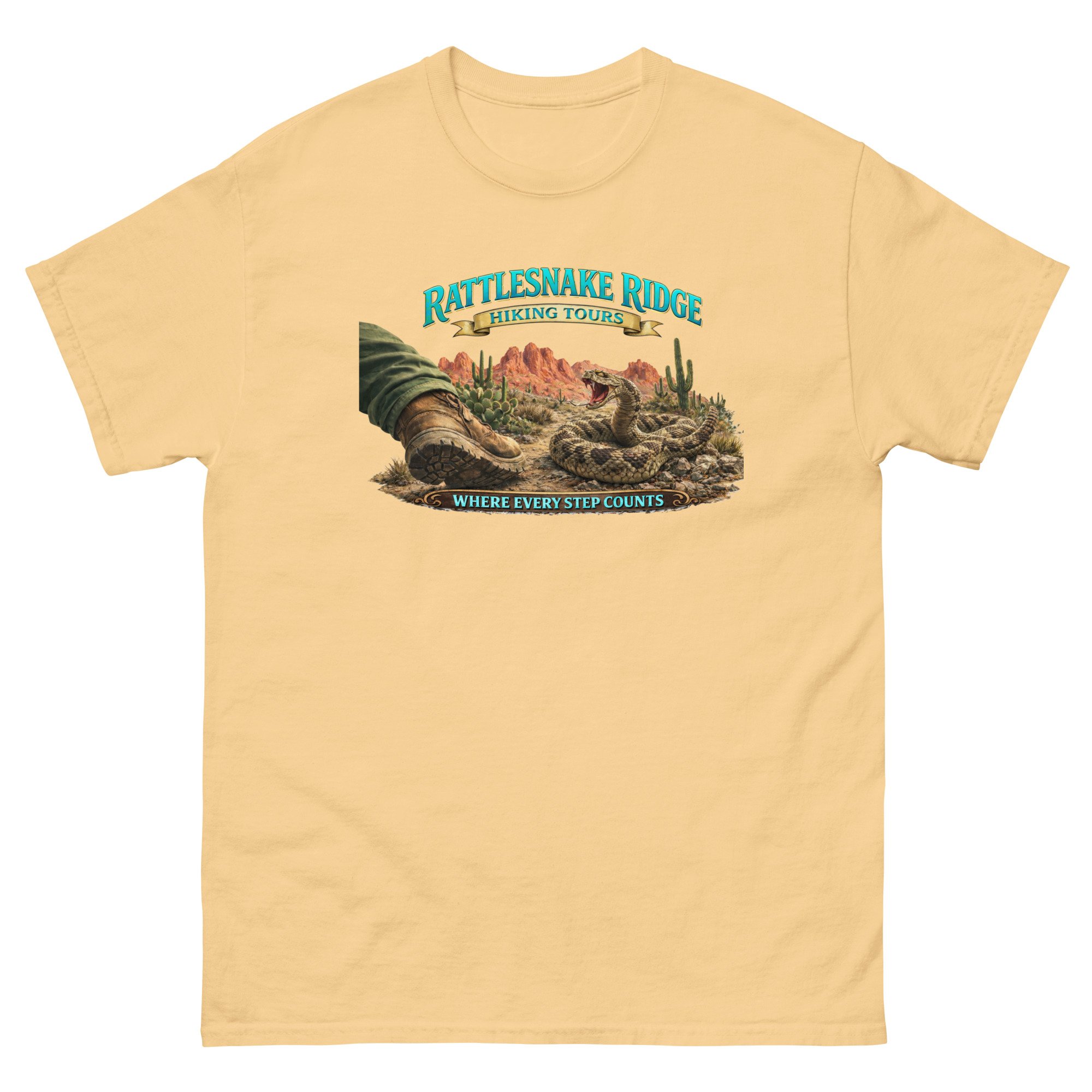 If your idea of a good time includes heat, dust, questionable decisions, and a rattlesnake giving you side-eye—Rattlesnake Ridge Hiking Tours might be your kind of place. Equal parts adventure and “what was I thinking,” this design feels like somewhere you’ve been… or barely survived. Designed by Vermont artist Angela Ezzo as part of The Painted Word Escape Collection, it brings that bold, slightly unhinged outdoor energy to life.