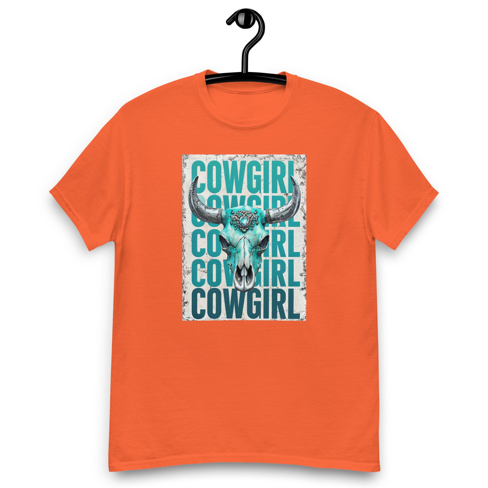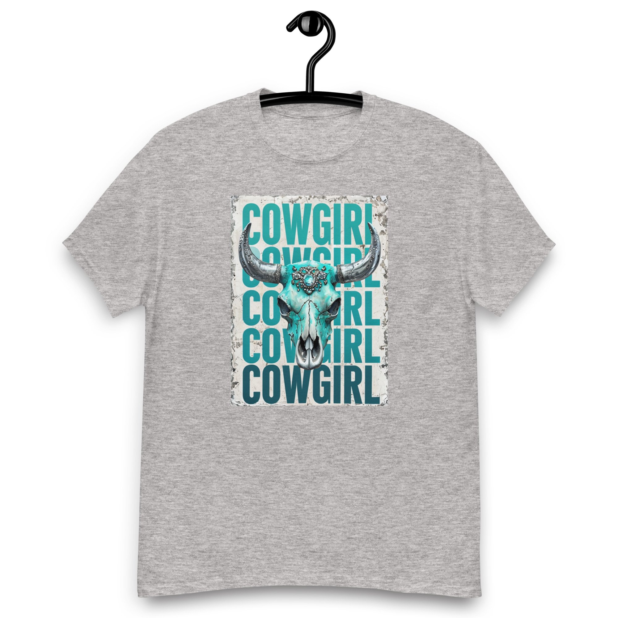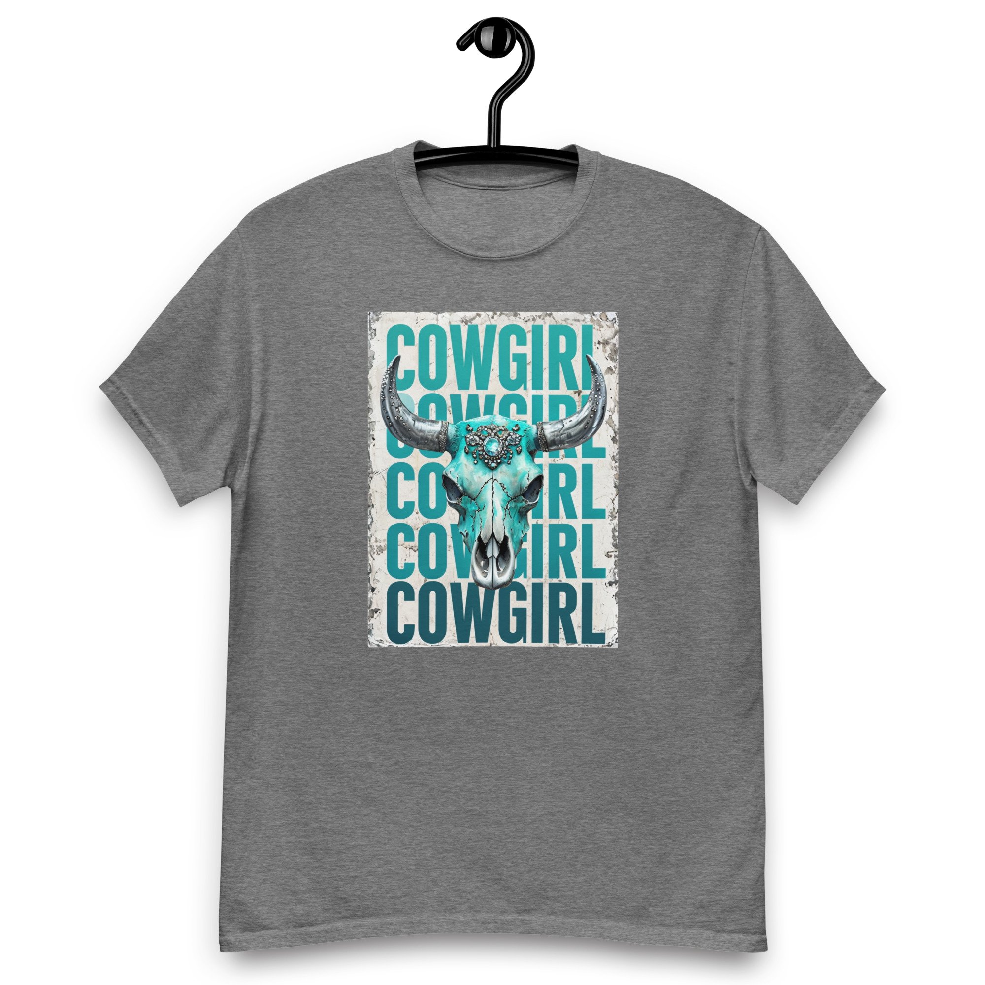 Cowgirl makes a bold western statement. Featuring a turquoise longhorn skull layered over repeated “COWGIRL” typography, this graphic tee captures modern western energy with southwestern edge.