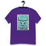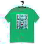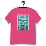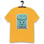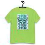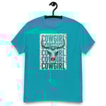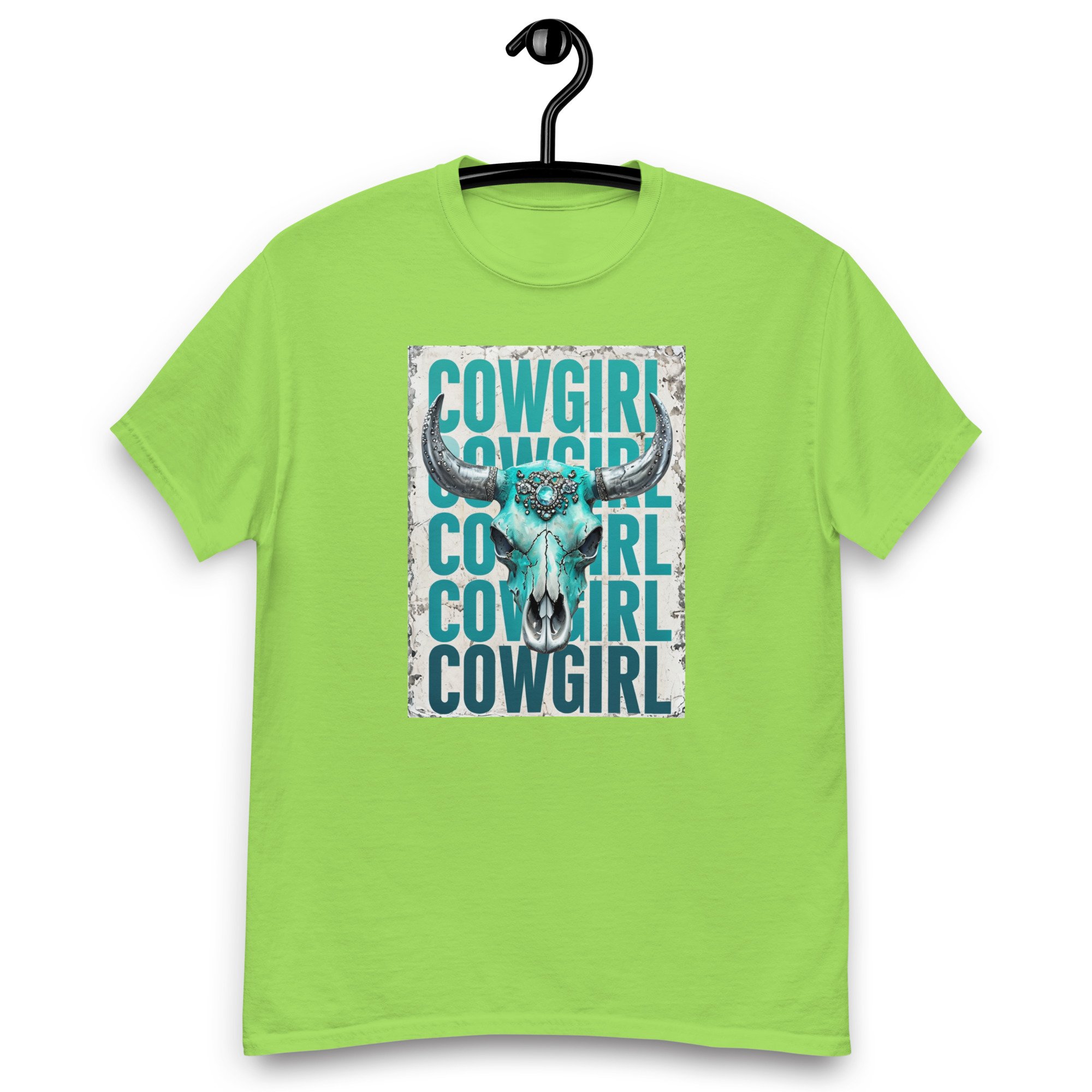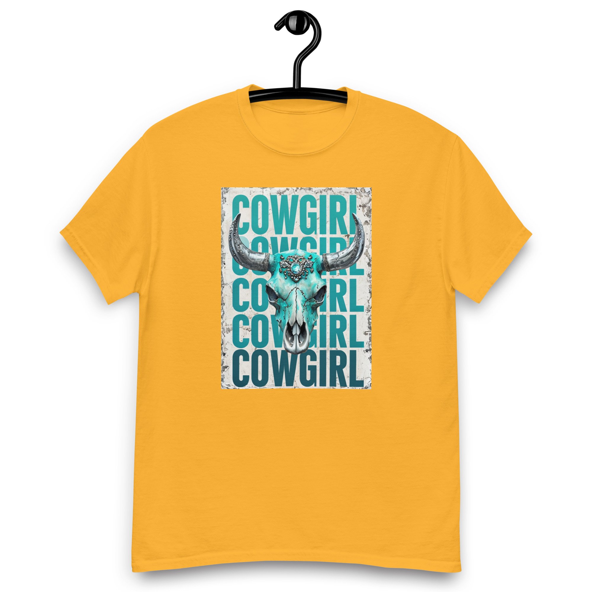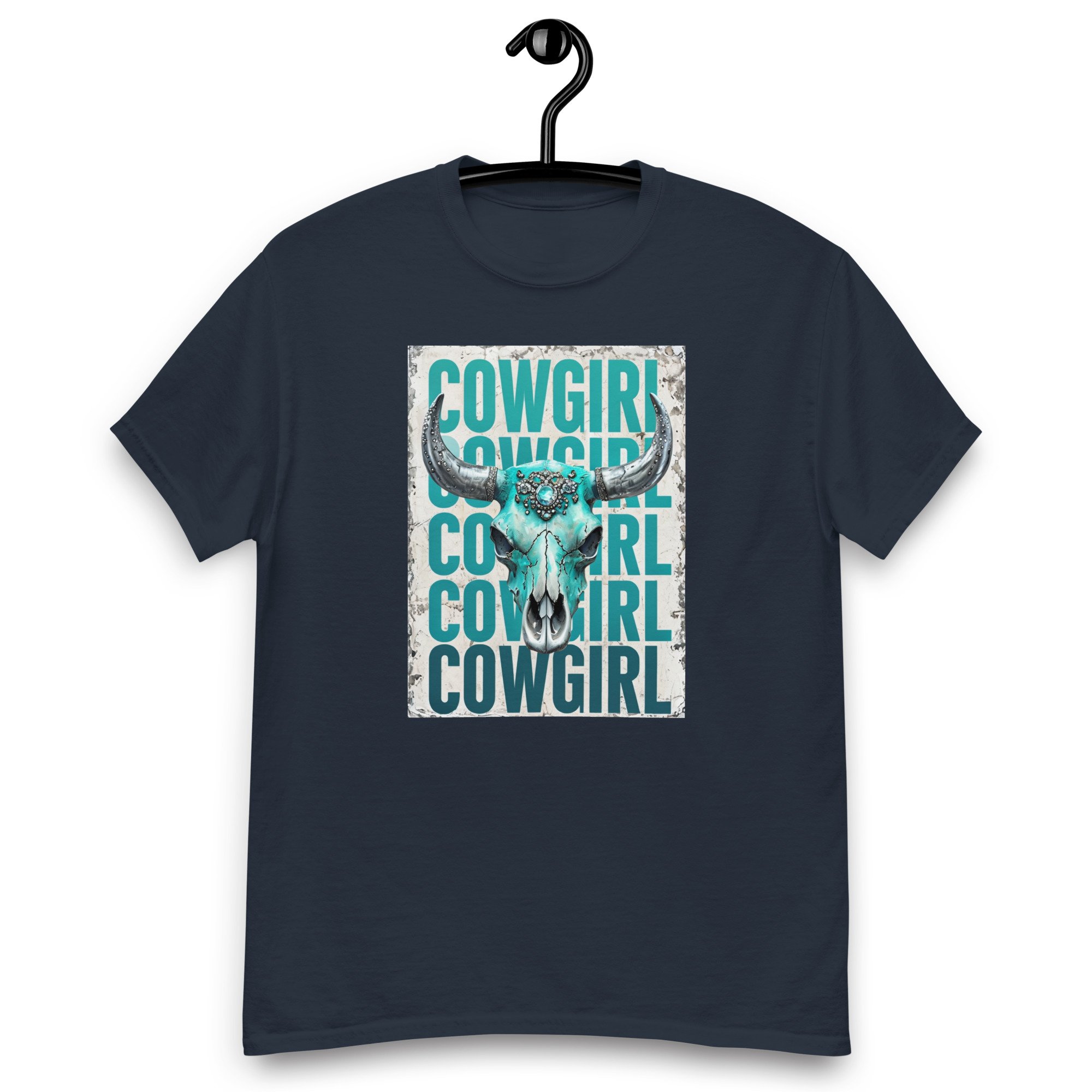 Cowgirl makes a bold western statement. Featuring a turquoise longhorn skull layered over repeated “COWGIRL” typography, this graphic tee captures modern western energy with southwestern edge.