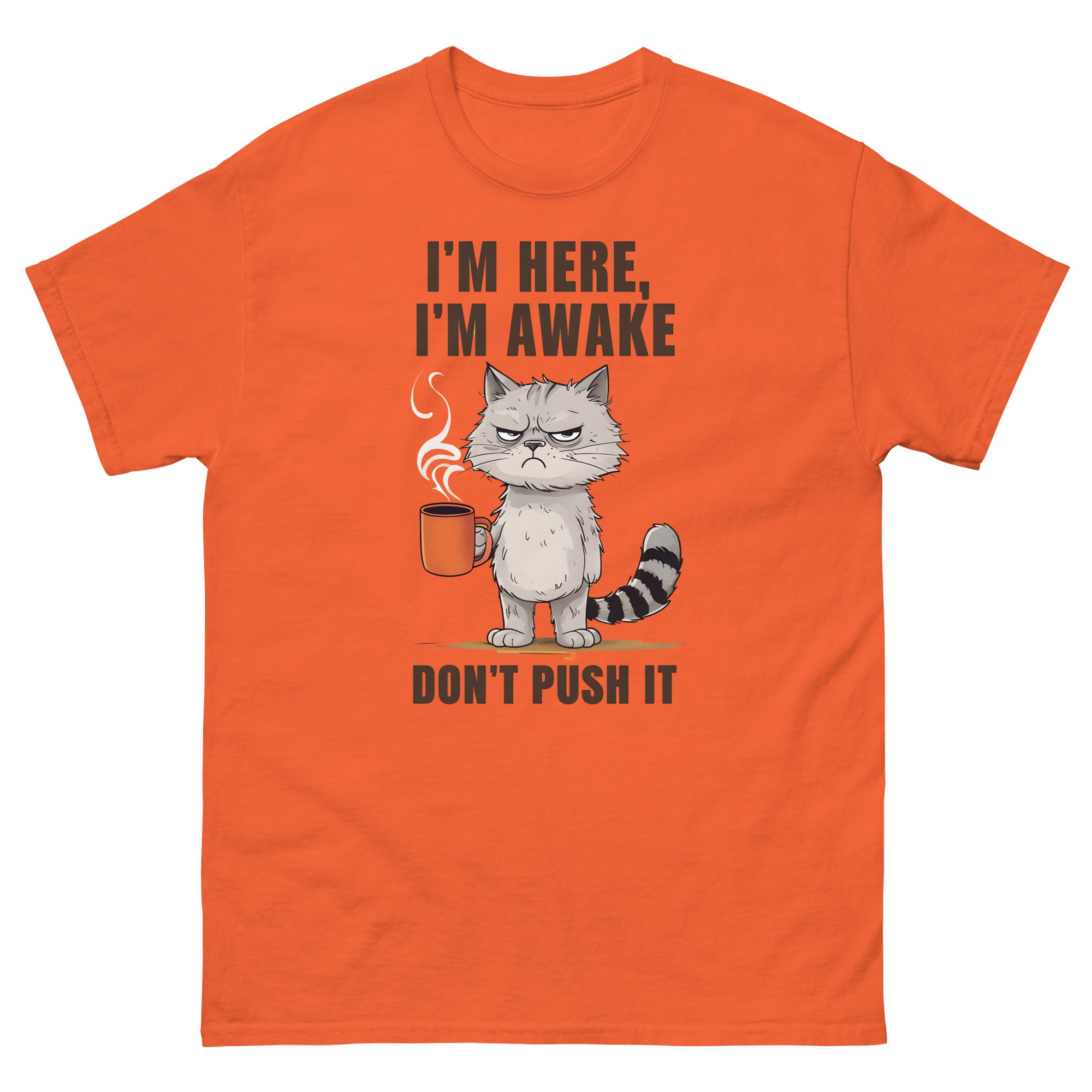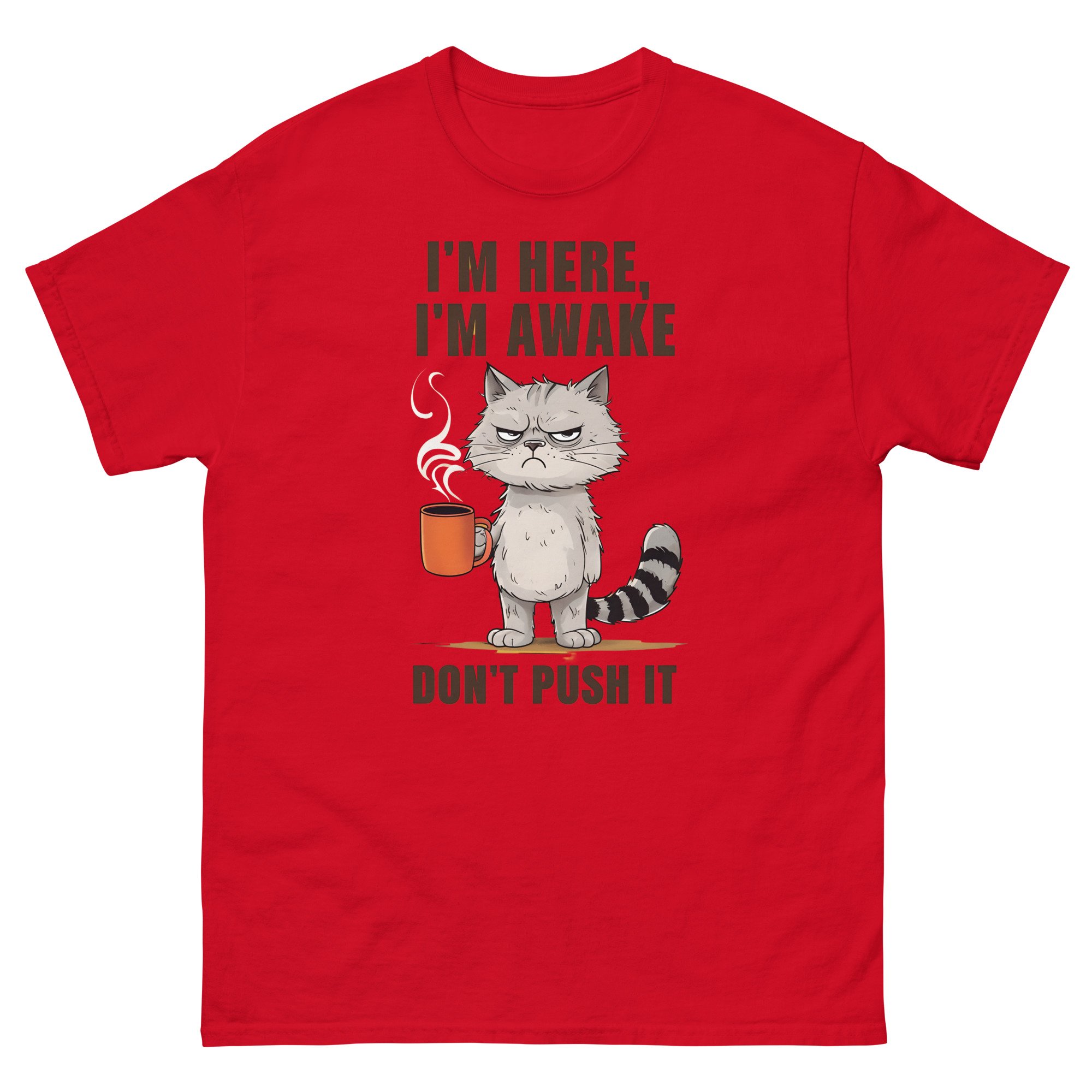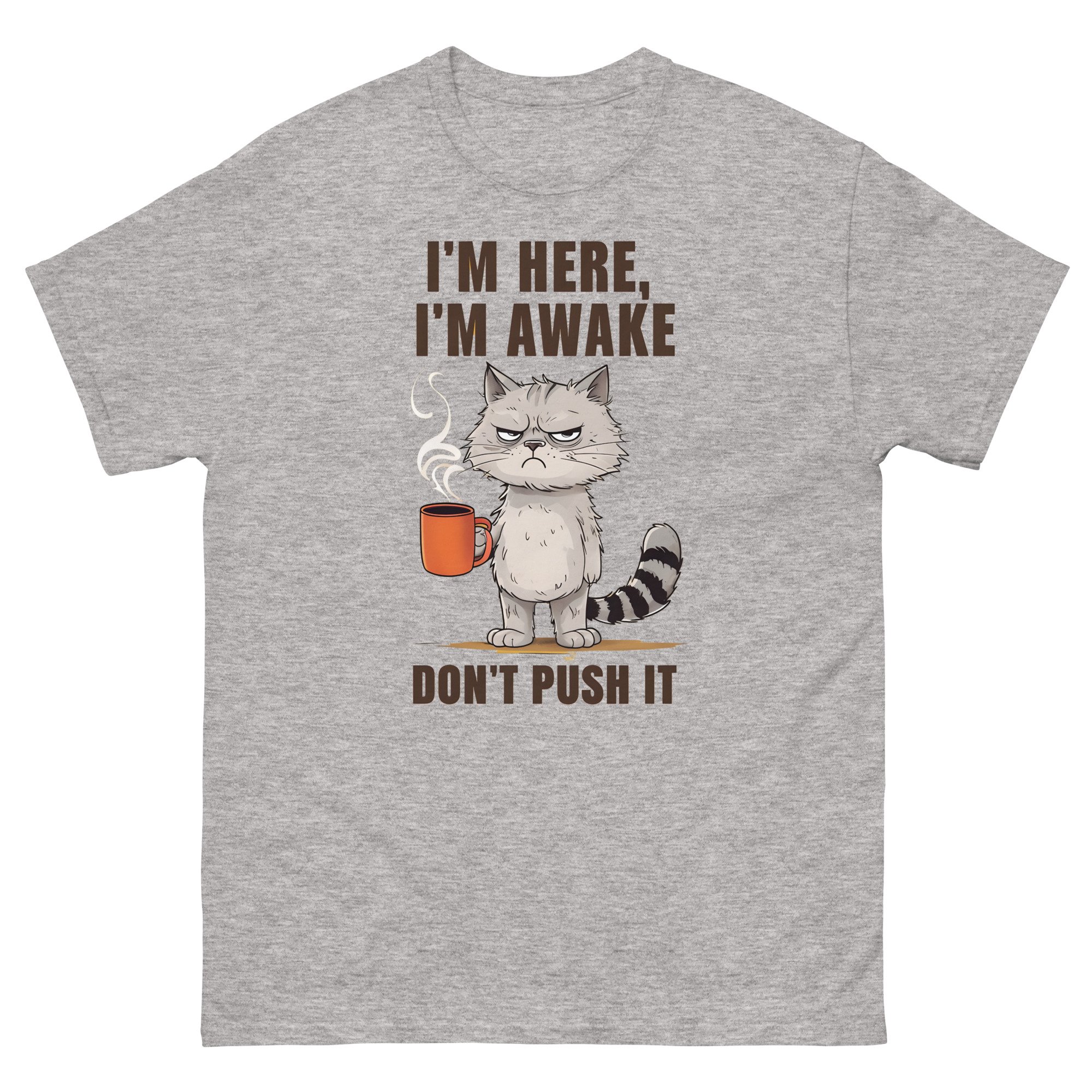 Unisex classic tee, I'm Here I'm Awake Don't Push It T-Shirt | Funny Grumpy Cat Coffee Graphic Tee