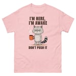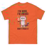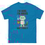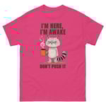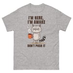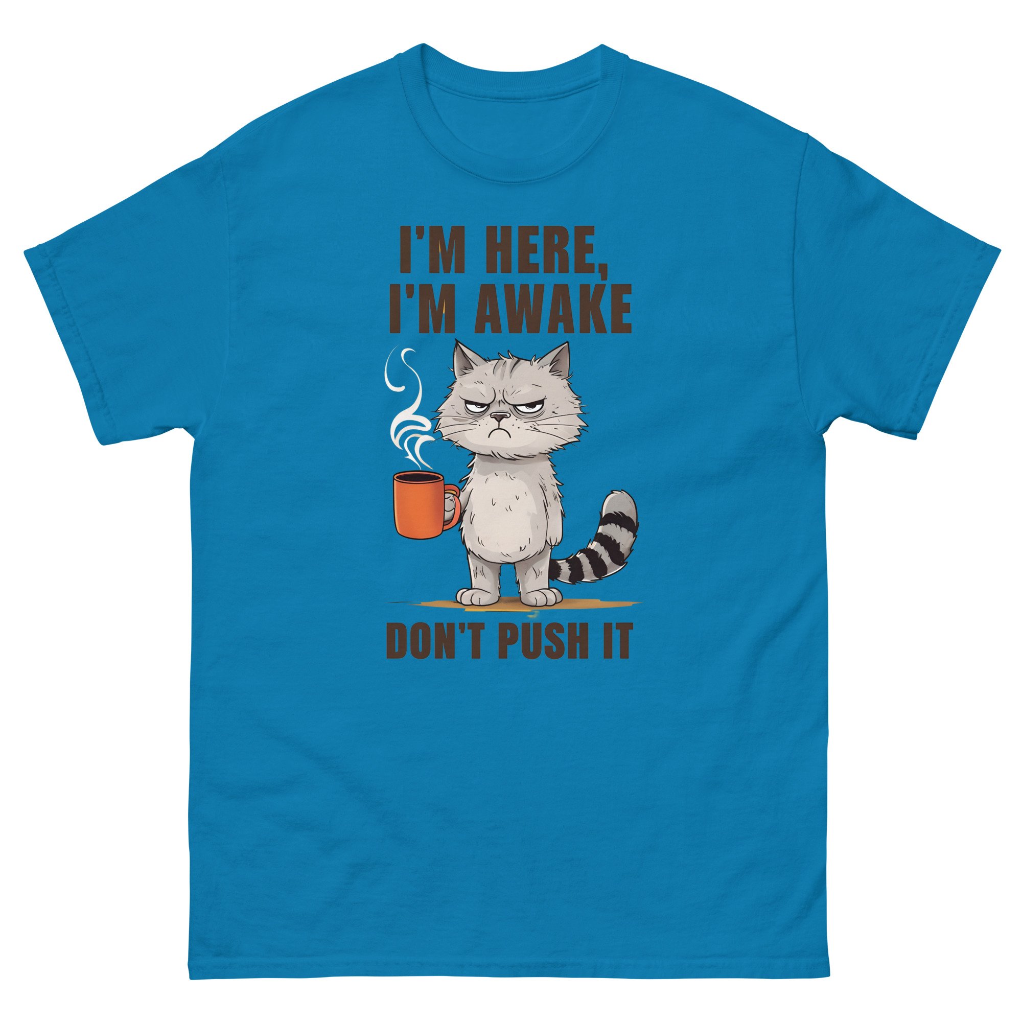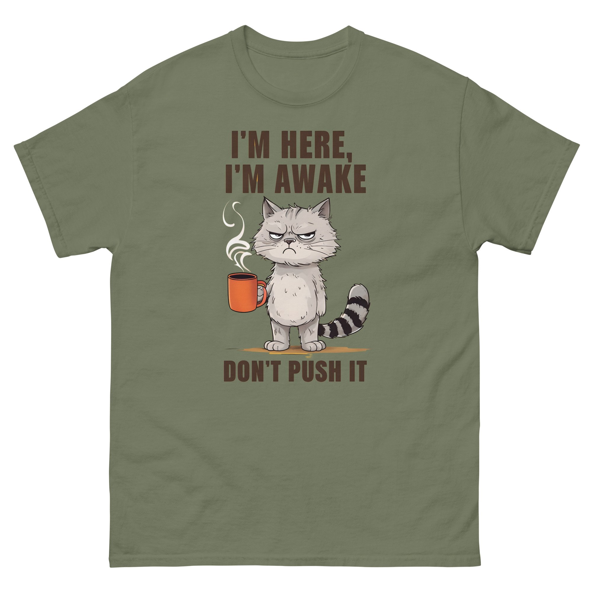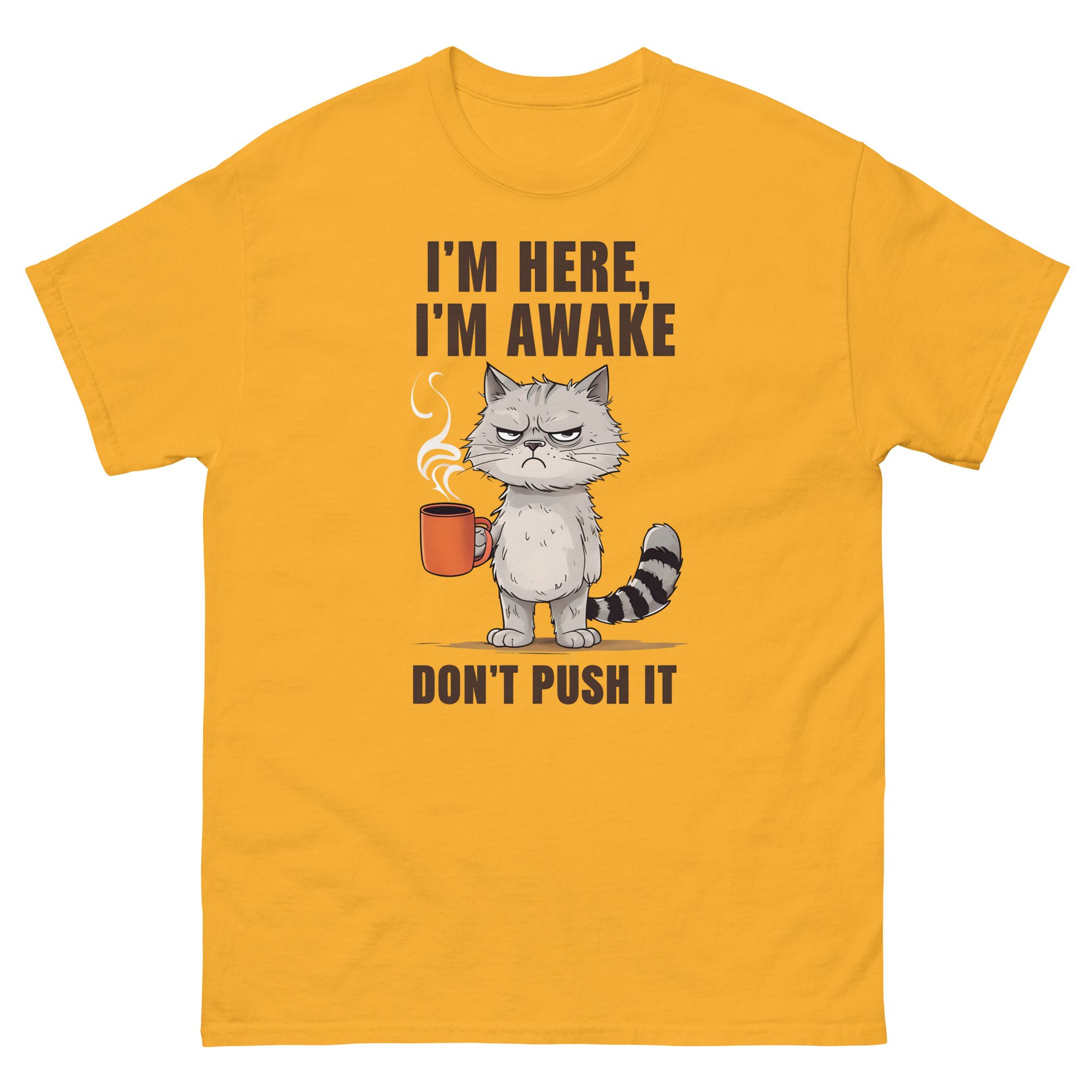 Unisex classic tee, I'm Here I'm Awake Don't Push It T-Shirt | Funny Grumpy Cat Coffee Graphic Tee