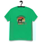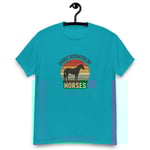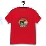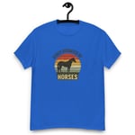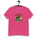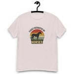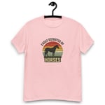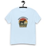 Easily Distracted by Horses says what every equestrian already knows. Featuring a retro sunset backdrop and bold horse silhouette, this western-inspired graphic tee blends vintage style with horse-loving humor.