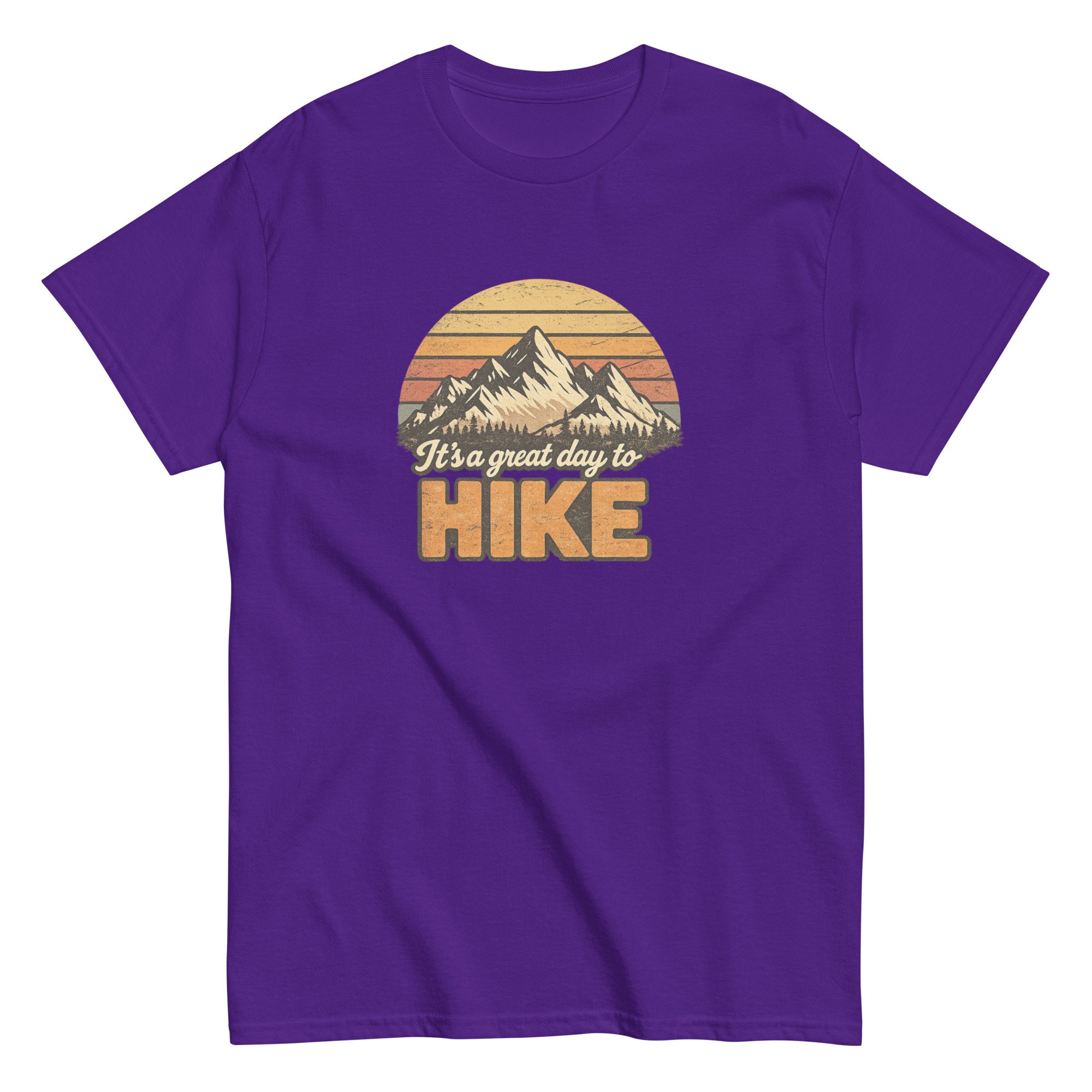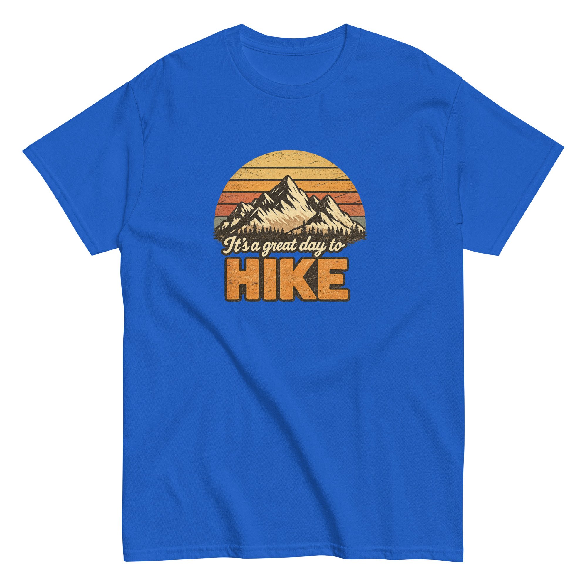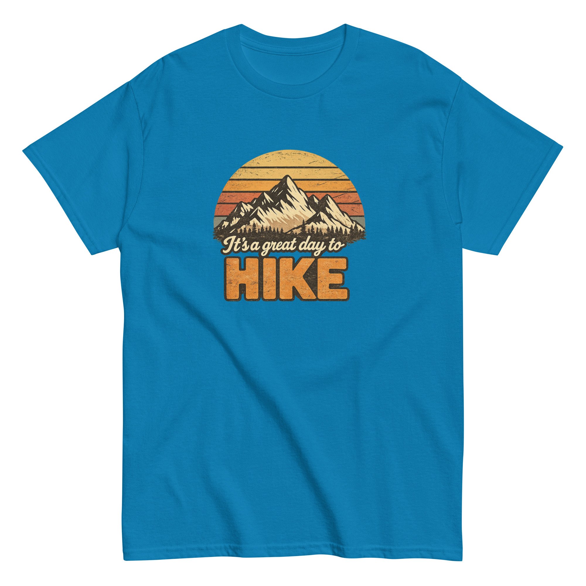Great Day to Hike is a classic outdoor-inspired design featuring a mountain landscape and retro sunset tones. The bold typography and scenic detail create a timeless look that reflects the freedom and simplicity of life on the trail.