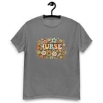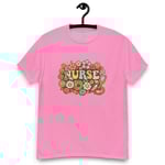 Nurse Retro features a fun, vintage-inspired design filled with playful florals, peace signs, and classic nurse elements that create a bold flower power aesthetic. This graphic tee blends retro charm with modern appreciation for healthcare professionals, making it both eye-catching and meaningful.