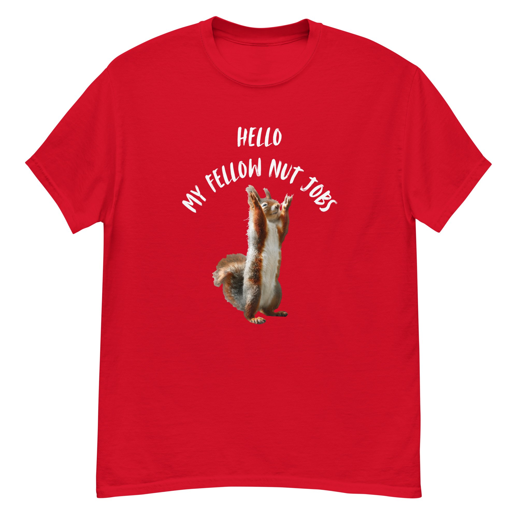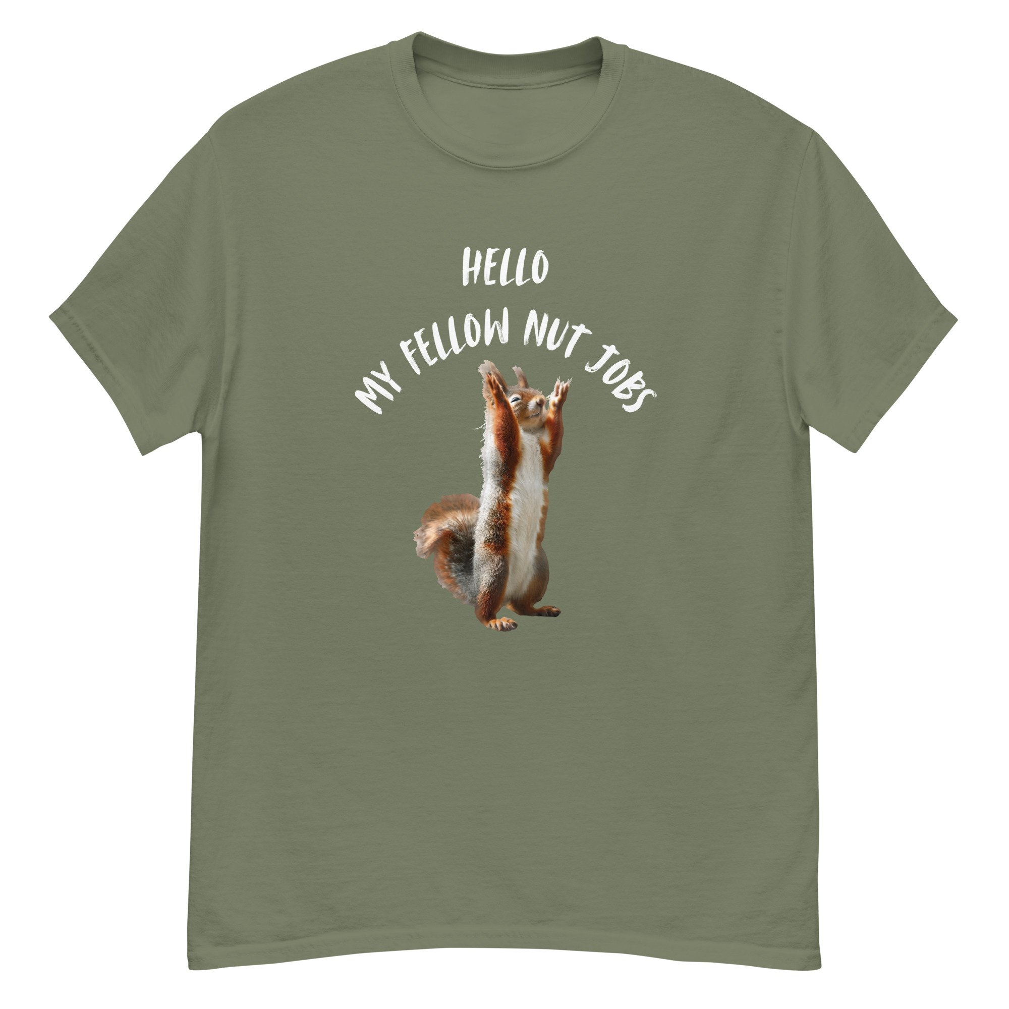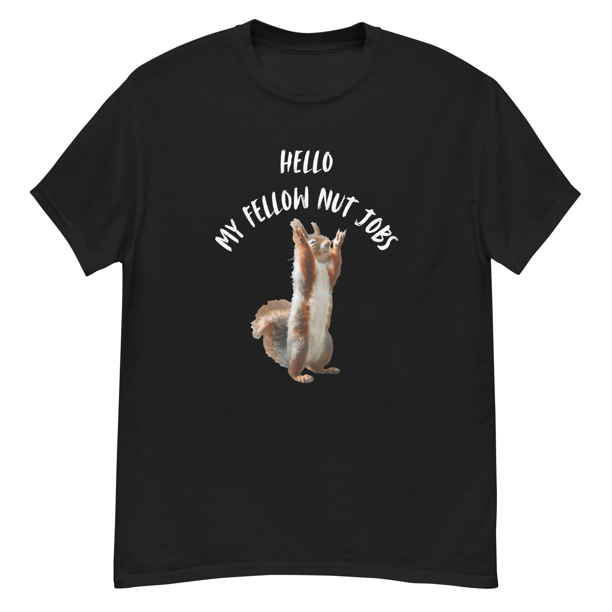 Funny Squirrel Graphic Tee, Sarcastic Animal Humor T-Shirt, Meme Style Squirrel Shirt, Hello My Fellow Nut Jobs features a hilariously animated squirrel standing upright with raised paws, paired with bold, playful text that captures chaotic humor and lighthearted sarcasm. This fun and expressive design embraces the wild, unpredictable side we all have, making it instantly relatable and entertaining. The clean composition and humorous concept create a standout look that works perfectly for casual wear or as a conversation-starting gift. Ideal for squirrel lovers, sarcasm fans, and anyone who appreciates clever animal humor with a touch of personality.