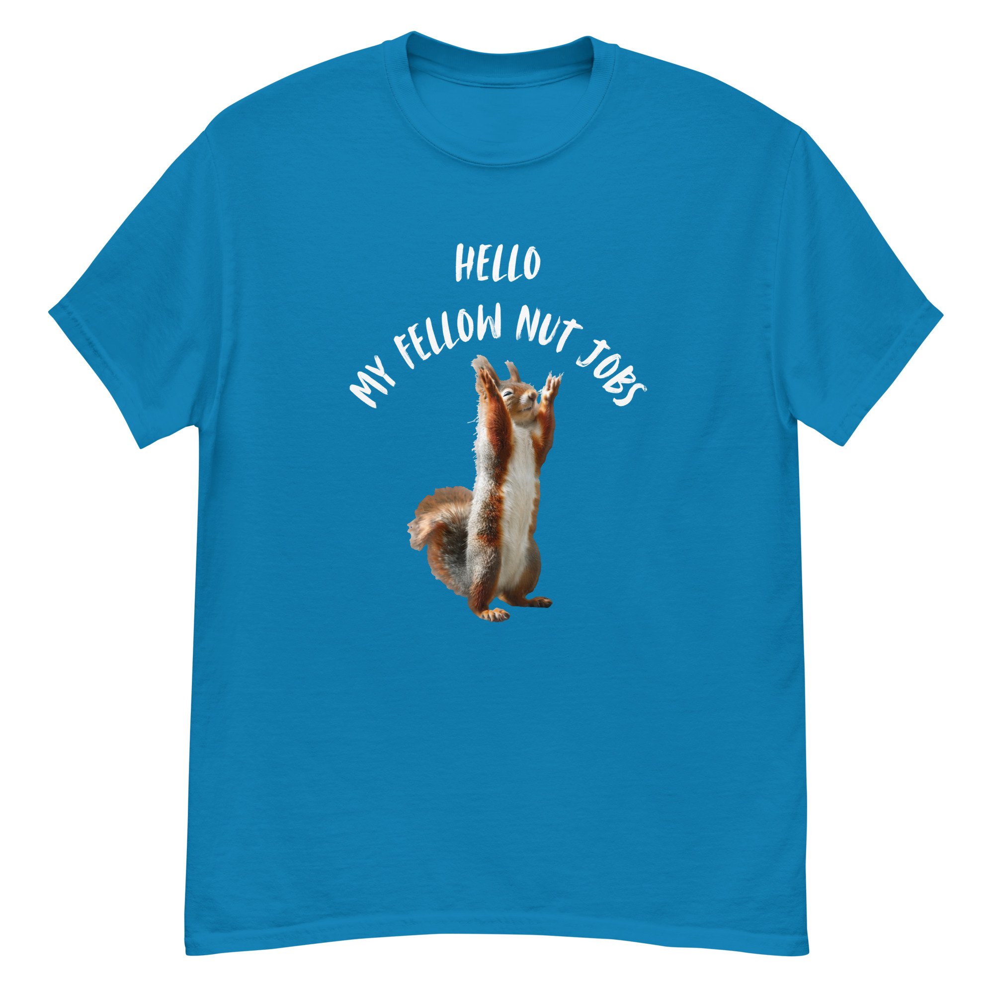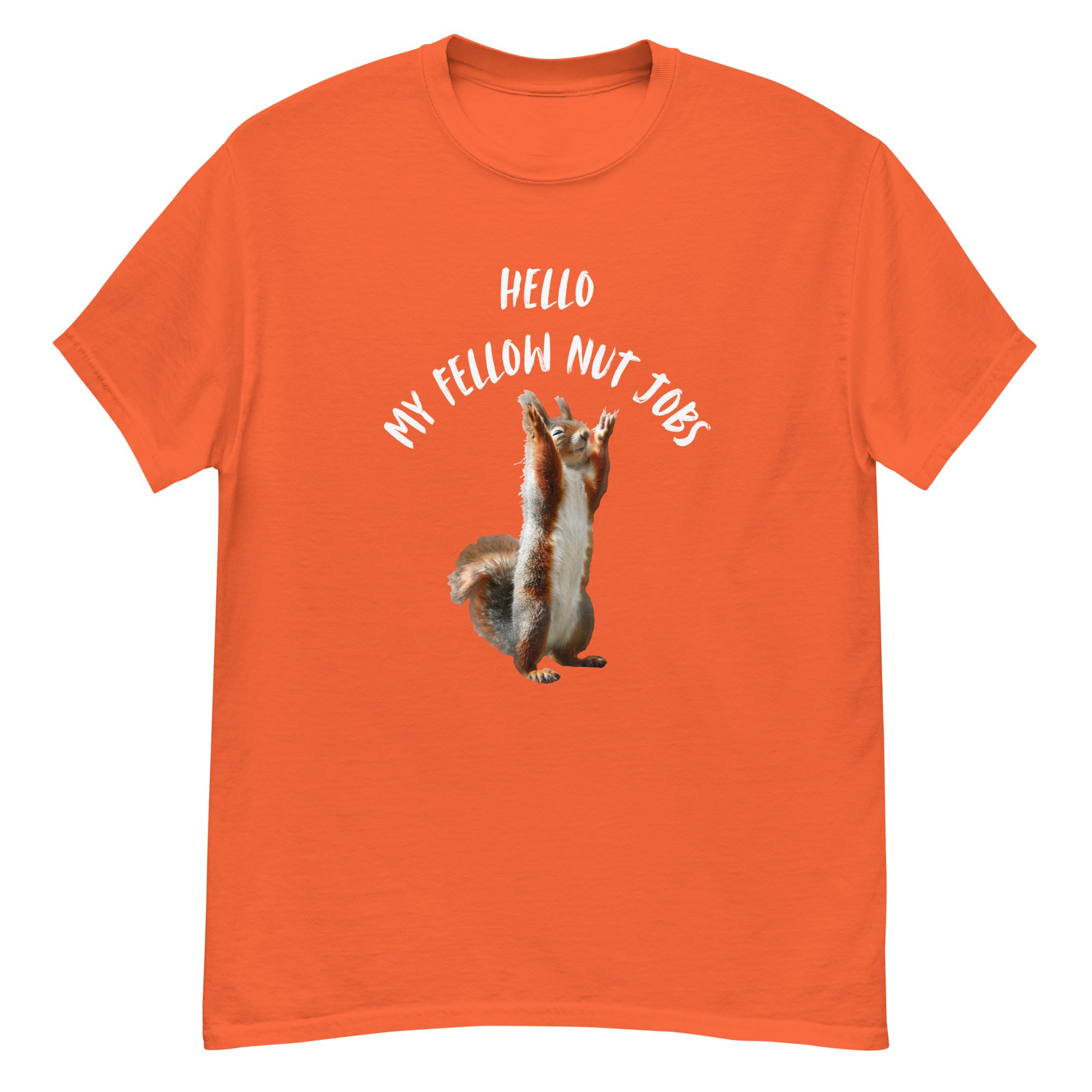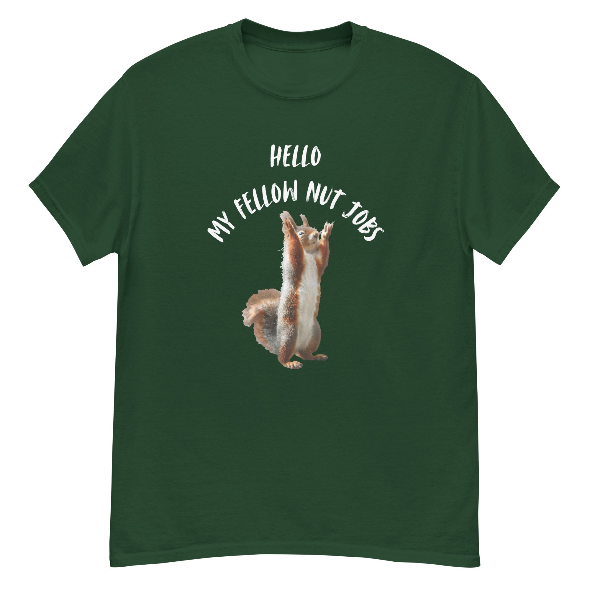 Funny Squirrel Graphic Tee, Sarcastic Animal Humor T-Shirt, Meme Style Squirrel Shirt, Hello My Fellow Nut Jobs features a hilariously animated squirrel standing upright with raised paws, paired with bold, playful text that captures chaotic humor and lighthearted sarcasm. This fun and expressive design embraces the wild, unpredictable side we all have, making it instantly relatable and entertaining. The clean composition and humorous concept create a standout look that works perfectly for casual wear or as a conversation-starting gift. Ideal for squirrel lovers, sarcasm fans, and anyone who appreciates clever animal humor with a touch of personality.