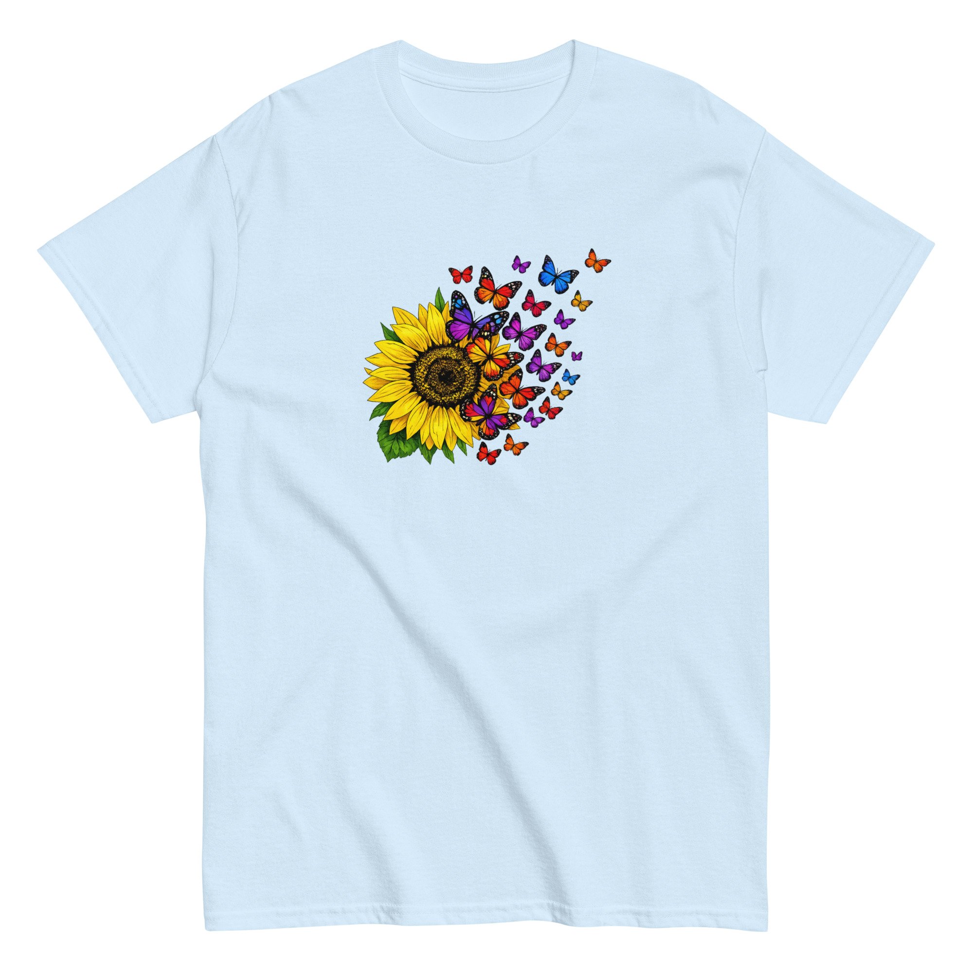 Sunflower & Butterfly Graphic Tee, Floral Butterfly T-Shirt, Colorful Nature Art Shirt, Petals & Painted Wings features a vibrant sunflower paired with a cascade of colorful butterflies, creating a beautiful sense of movement, transformation, and natural beauty.