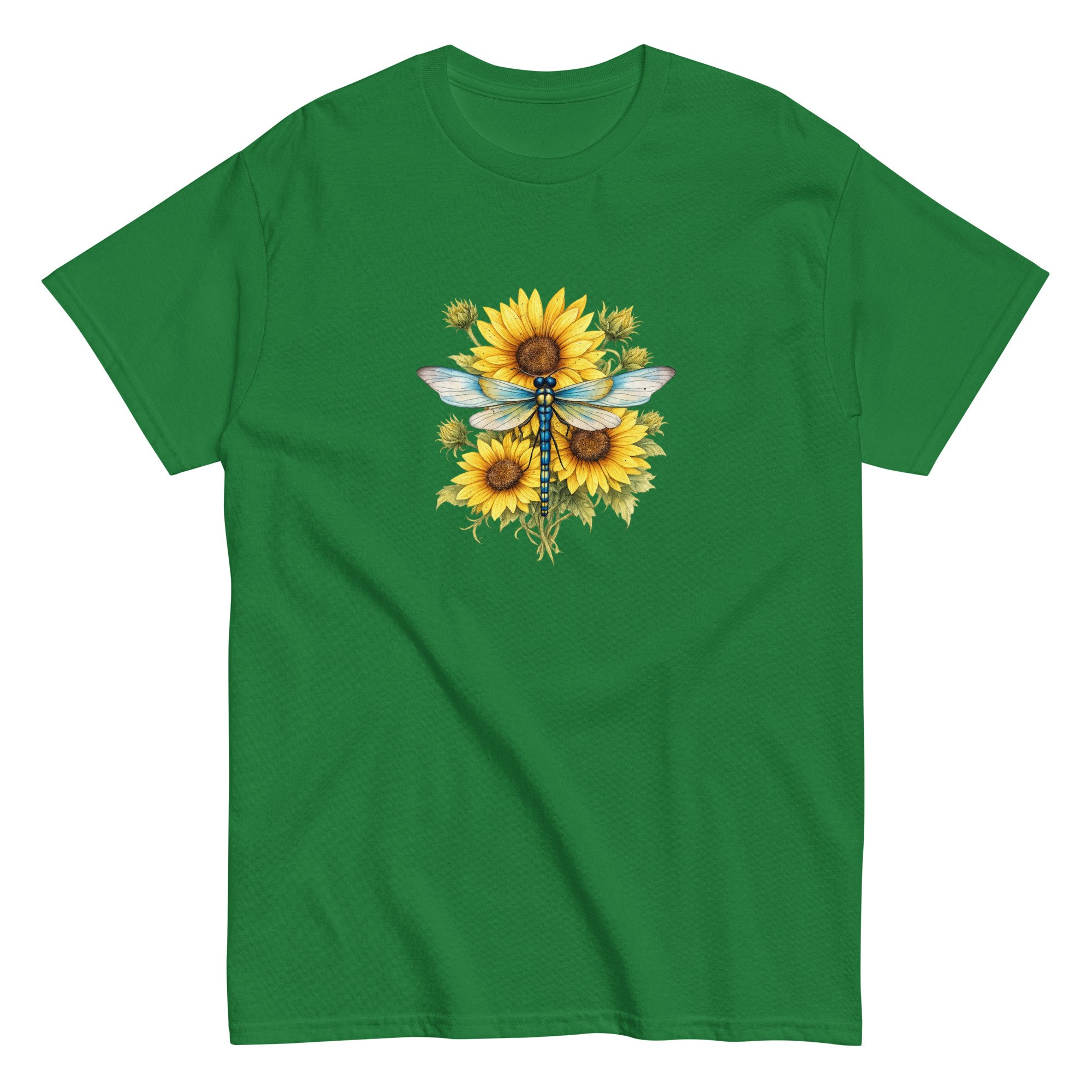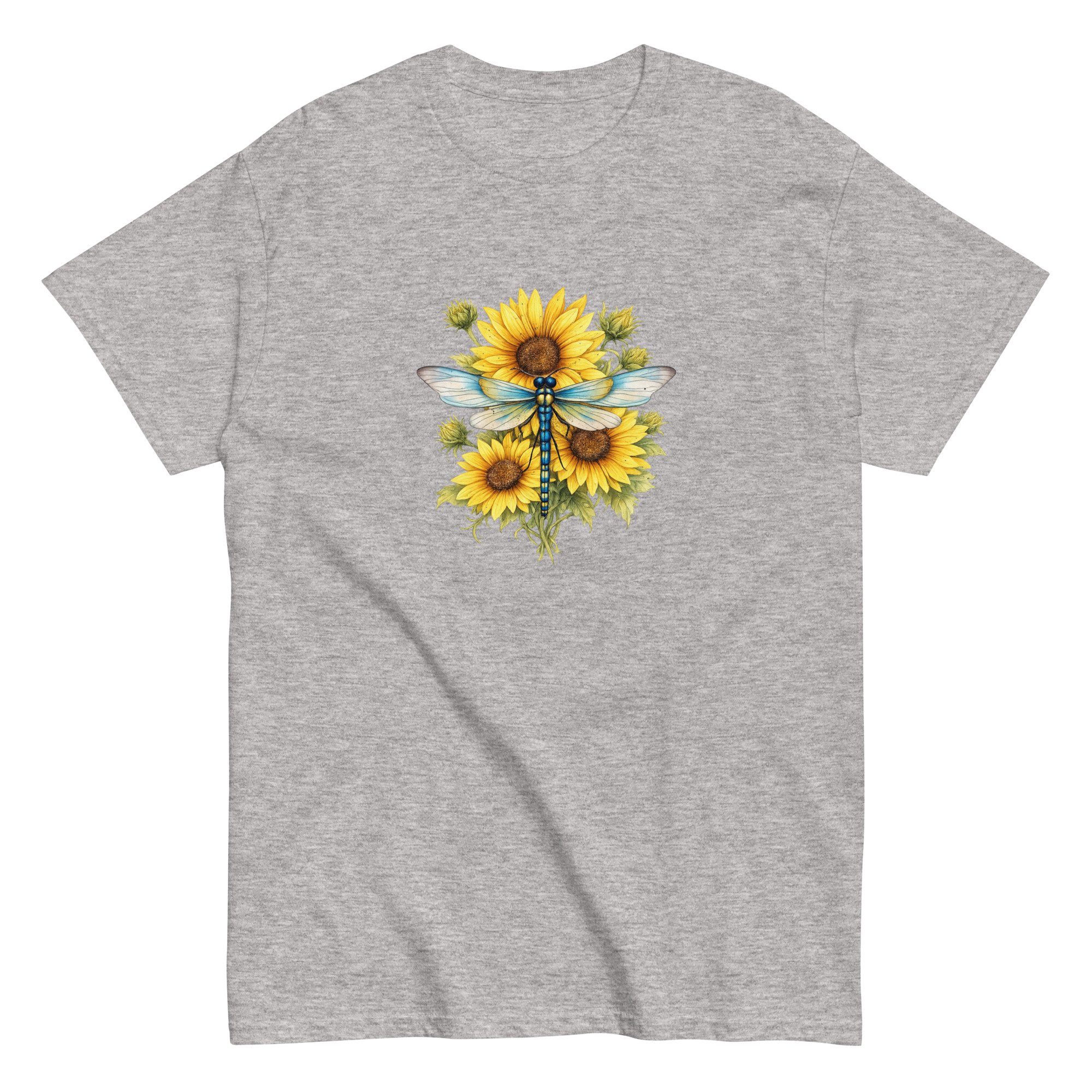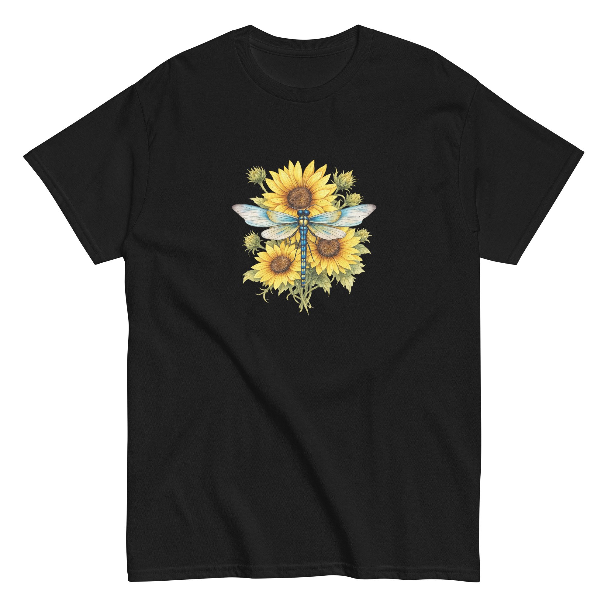 Sunflower Dragonfly Bouquet combines bold sunflower blooms with the gentle presence of a dragonfly, creating a balanced and uplifting nature design. This graphic tee blends warmth, color, and peaceful energy in a clean, wearable style.