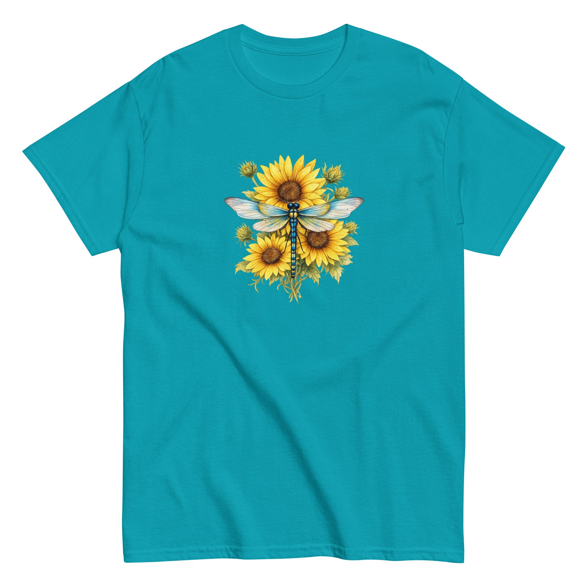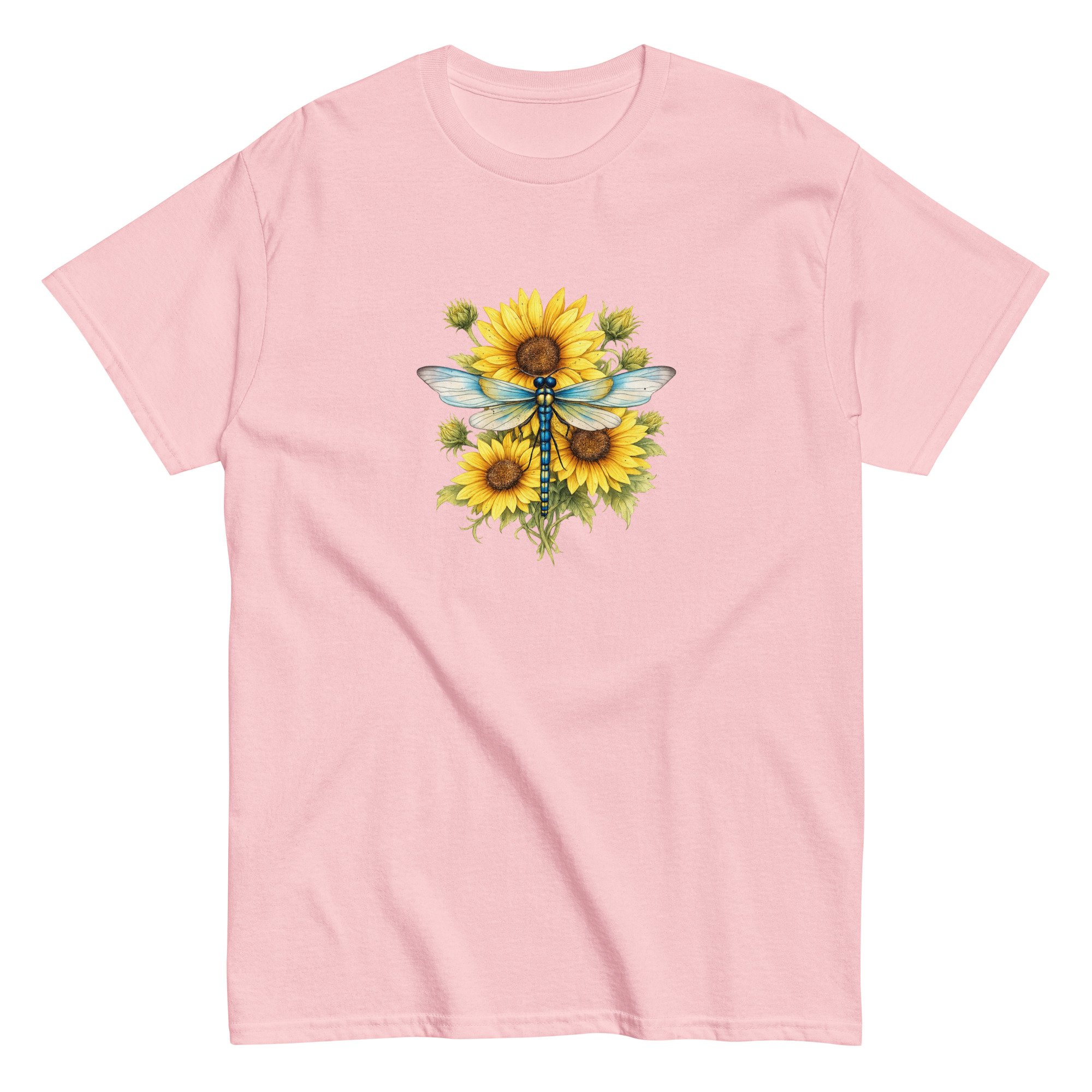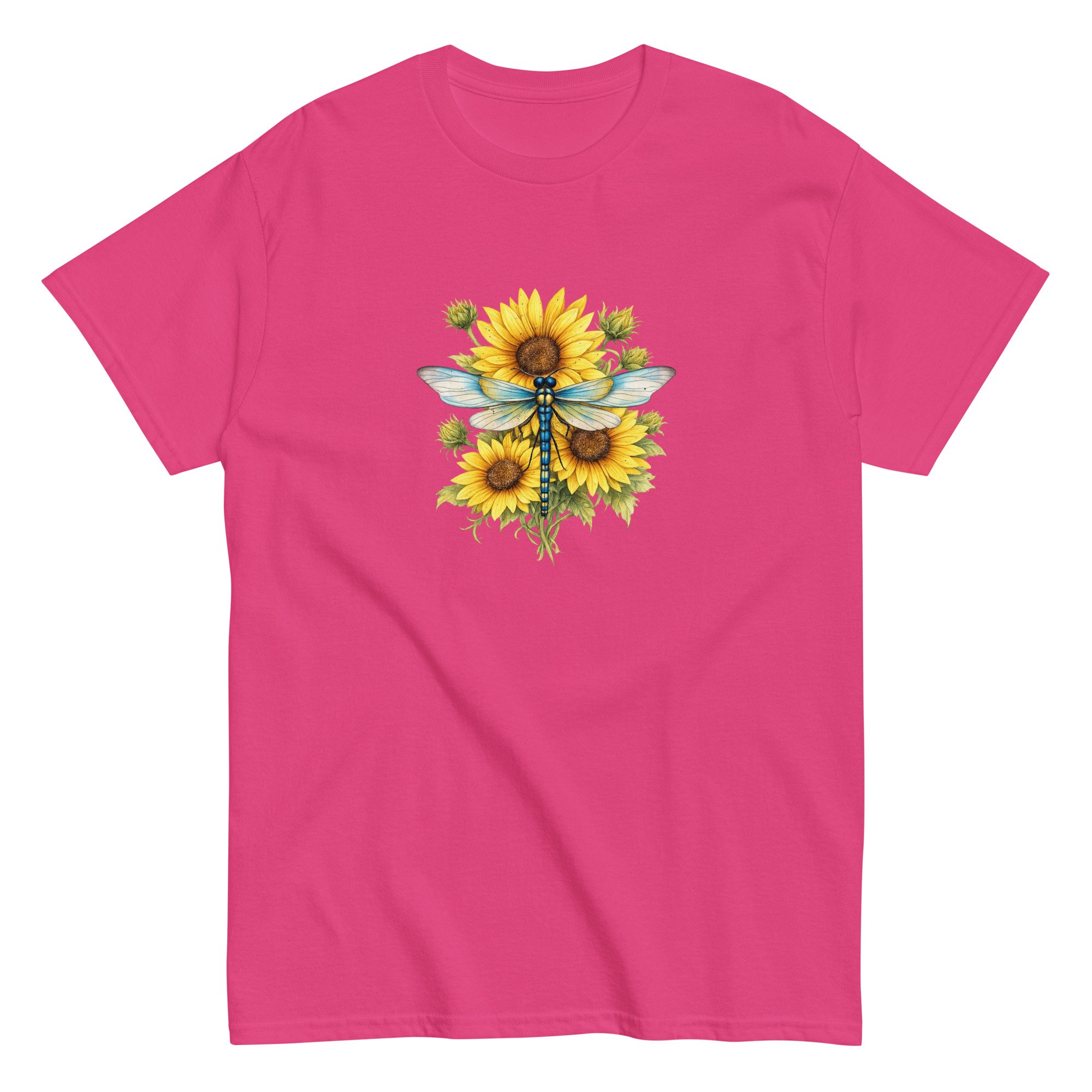 Sunflower Dragonfly Bouquet combines bold sunflower blooms with the gentle presence of a dragonfly, creating a balanced and uplifting nature design. This graphic tee blends warmth, color, and peaceful energy in a clean, wearable style.