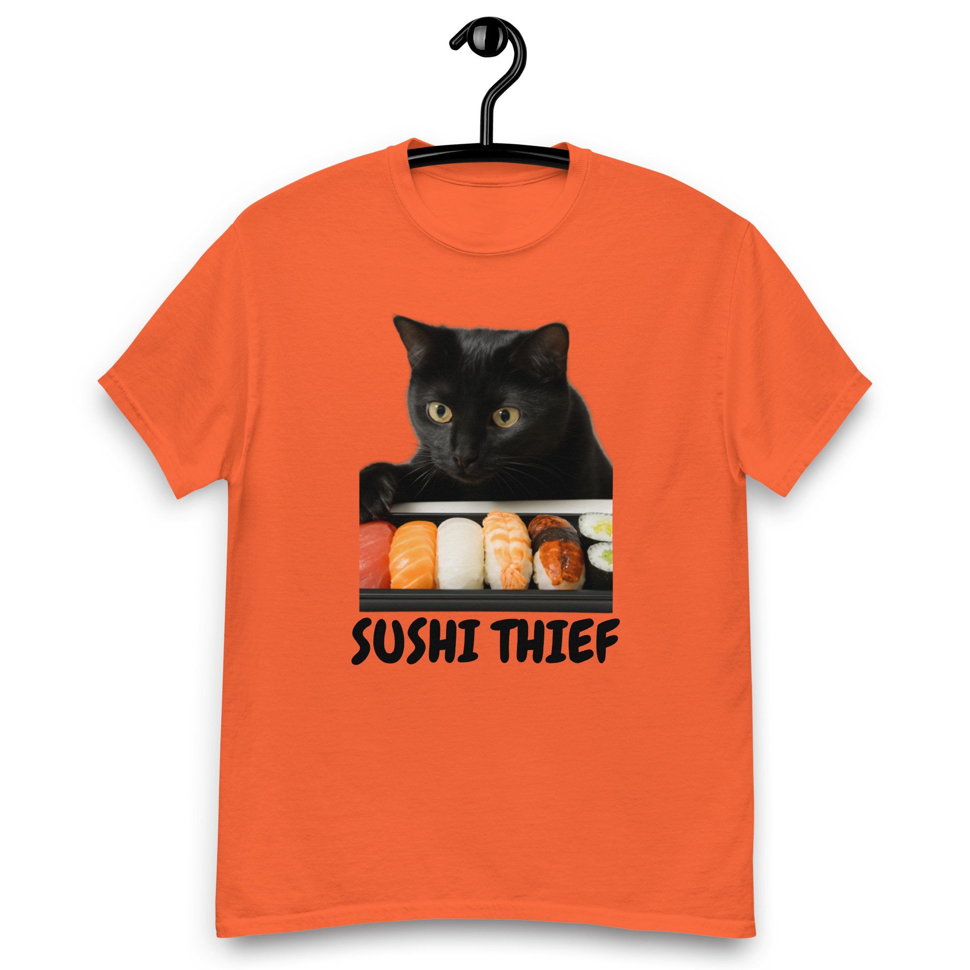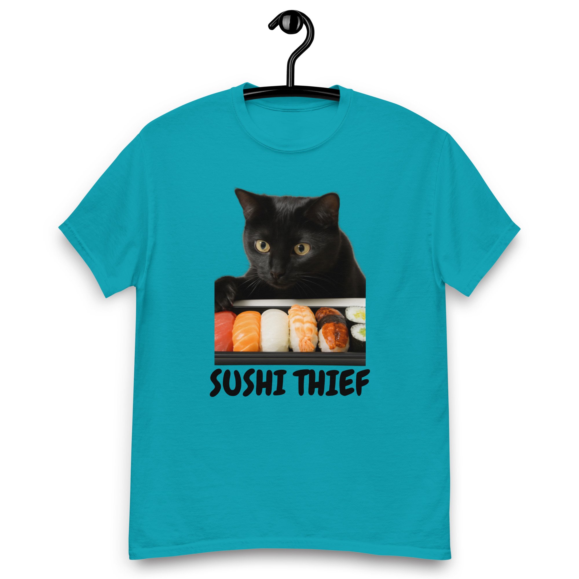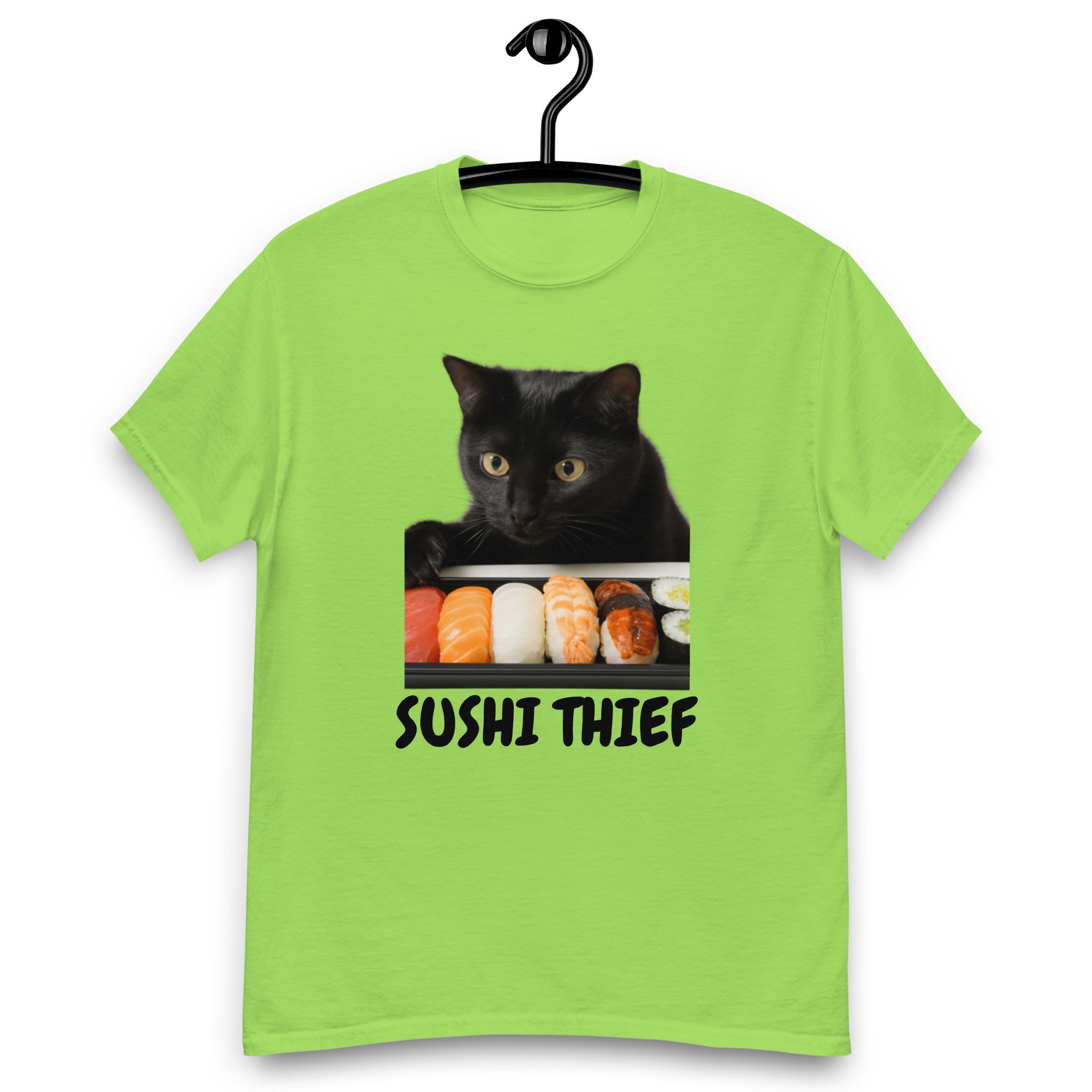 Unisex classic tee, Sushi Thief T-Shirt | Funny Cat Sushi Lover Graphic Tee