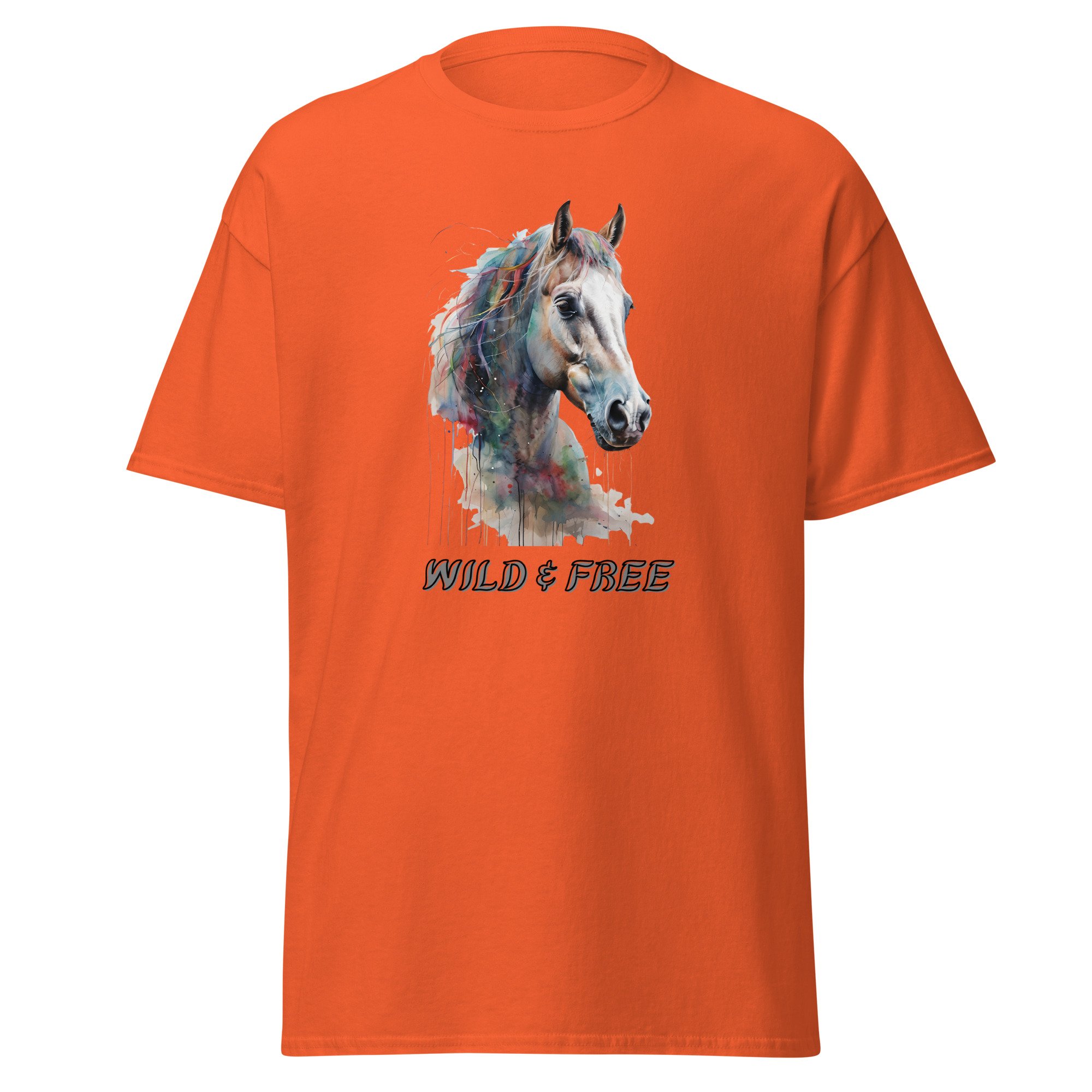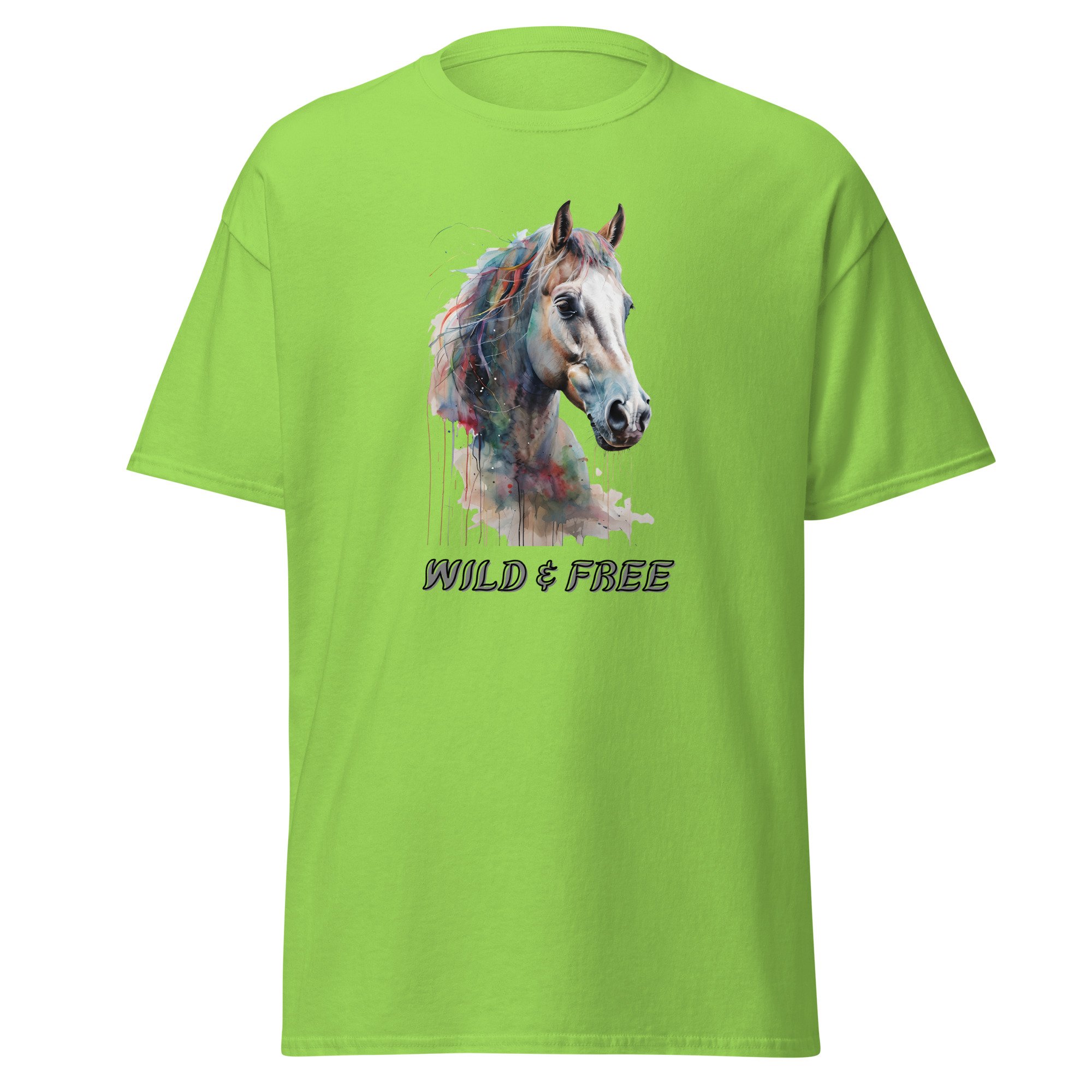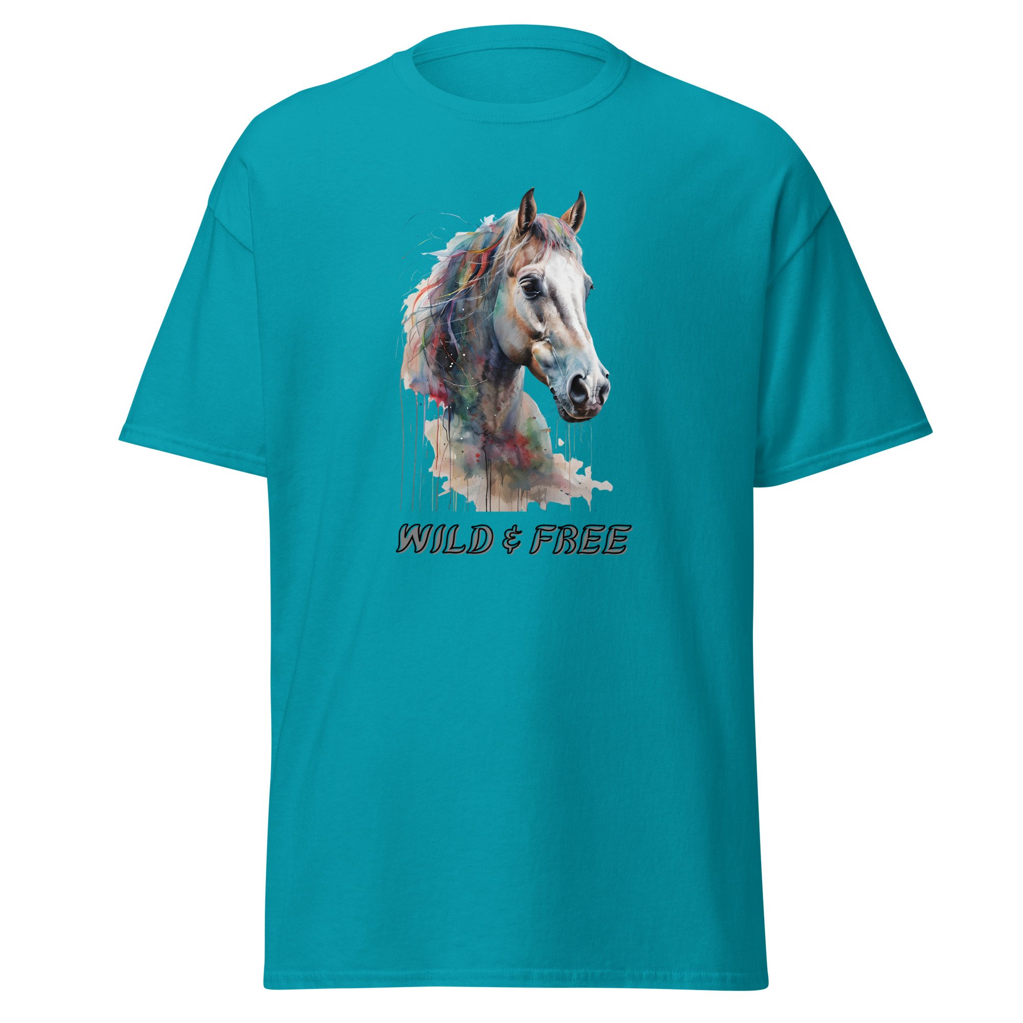 Horse Lover Graphic Tee, Watercolor Horse T-Shirt, Equestrian Wild Spirit Shirt, Wild & Free Horse features a beautifully detailed horse portrait with soft watercolor-style color blending and expressive movement, paired with the uplifting phrase “Wild & Free.” This design captures the spirit of independence, grace, and the deep connection between horse and rider, making it both meaningful and visually striking. The fluid, artistic colors and gentle drips create a sense of motion and emotion, giving the piece a light, airy feel while maintaining strong visual impact.