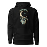 Wrap yourself in western spirit with this Moon Spirit Cowgirl hoodie, featuring a beautifully detailed crescent moon decorated with turquoise beads, rawhide, feathers, and Southwest-inspired charms.