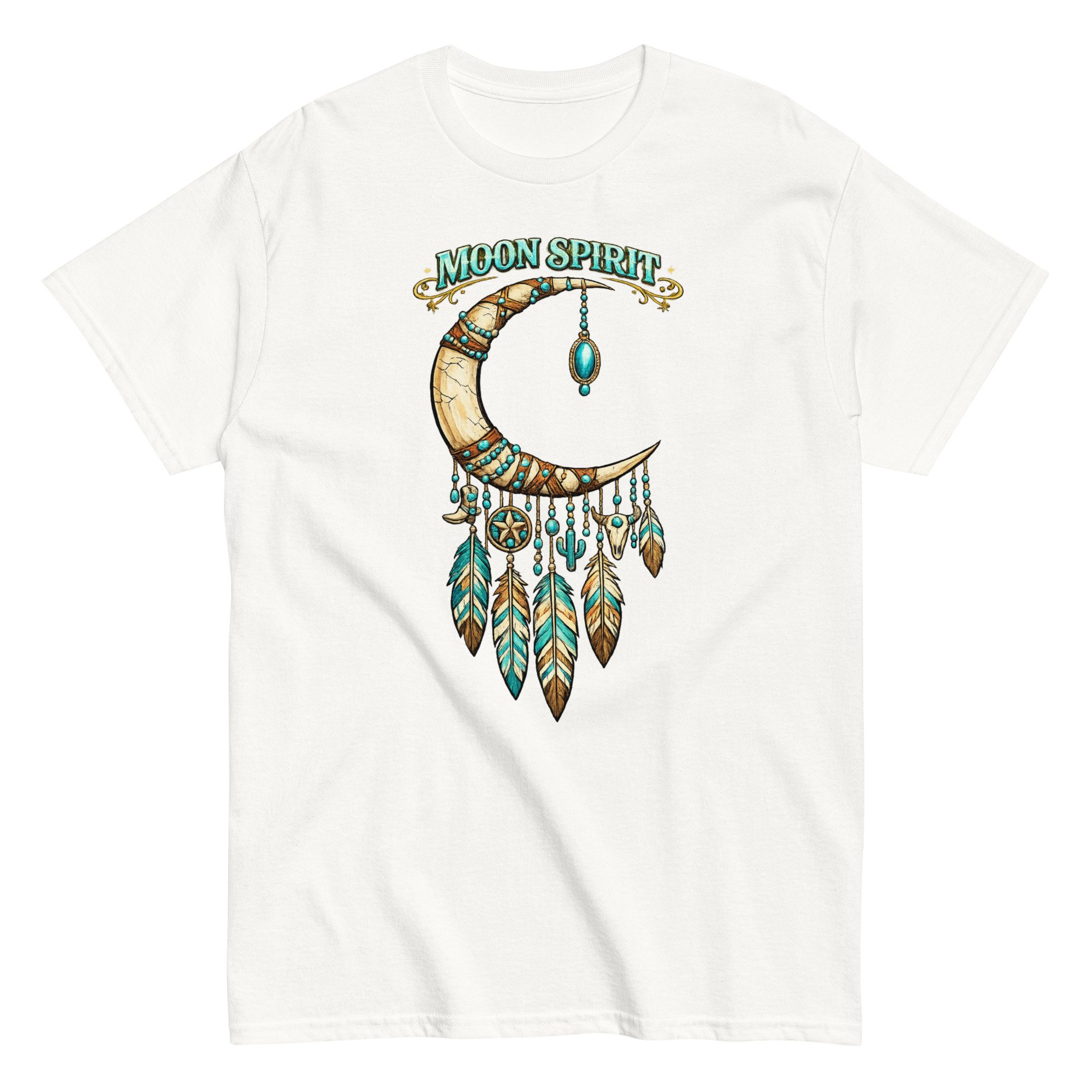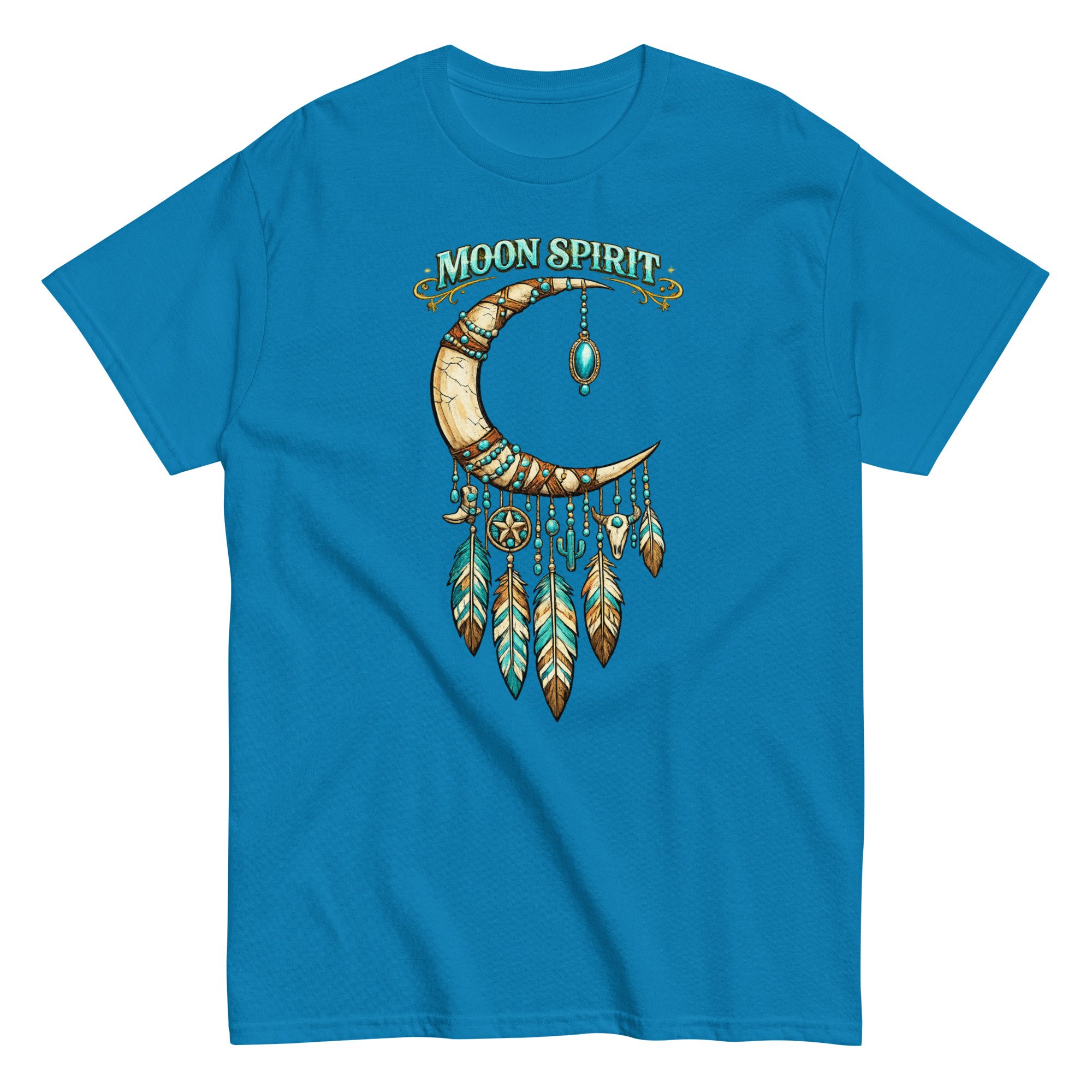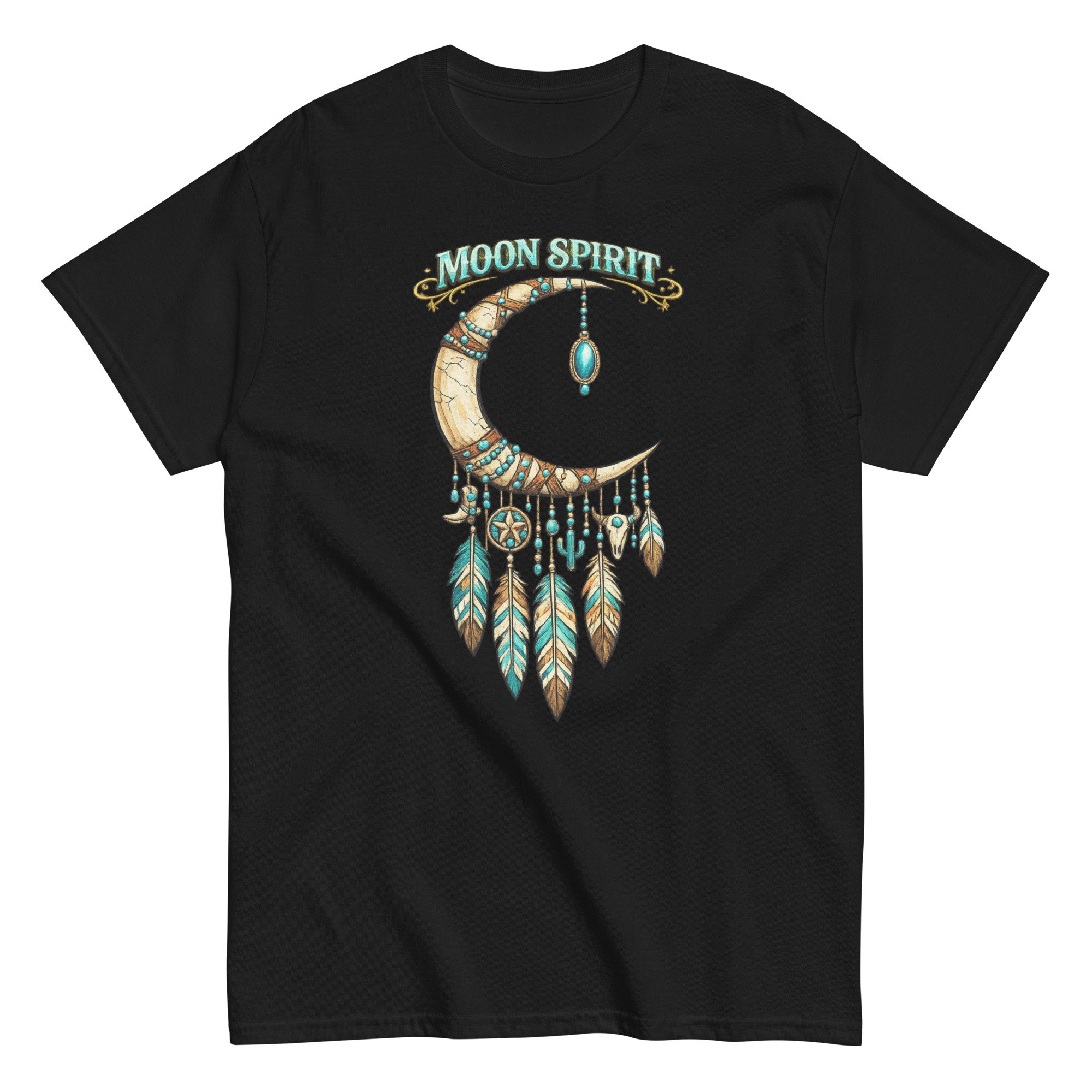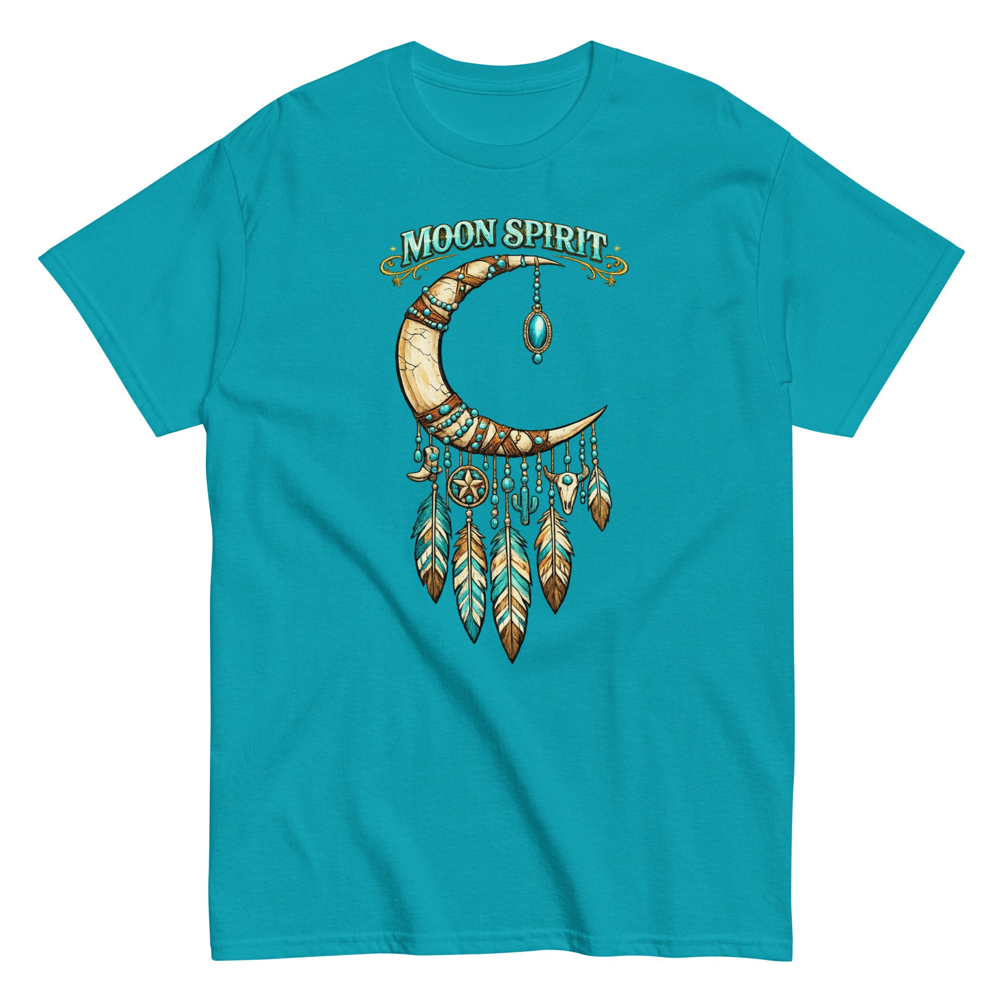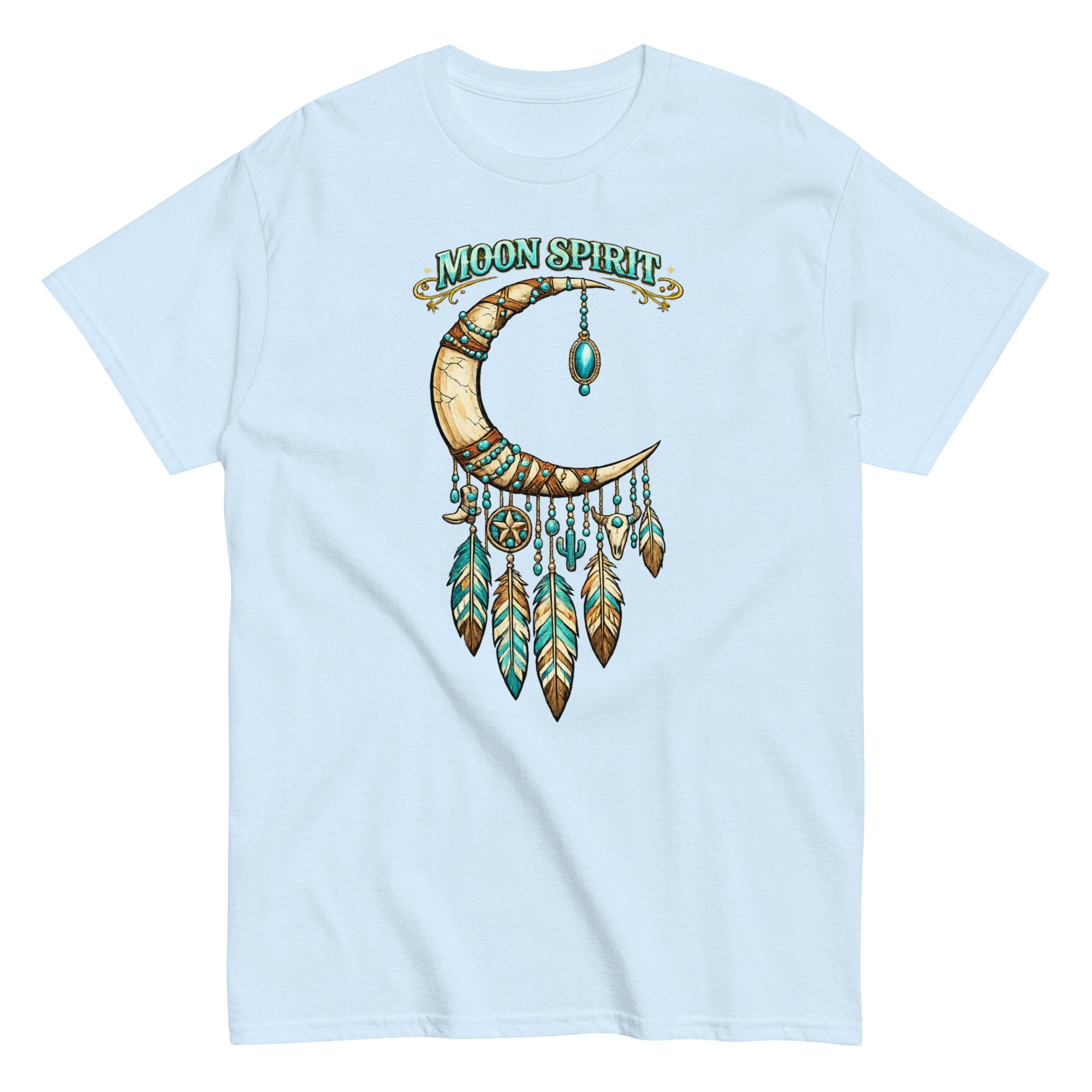 Moon Spirit Cowgirl T-Shirt – Western Crescent Moon Feather Graphic Tee, Turquoise Southwest Boho