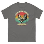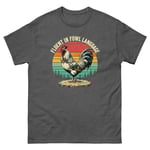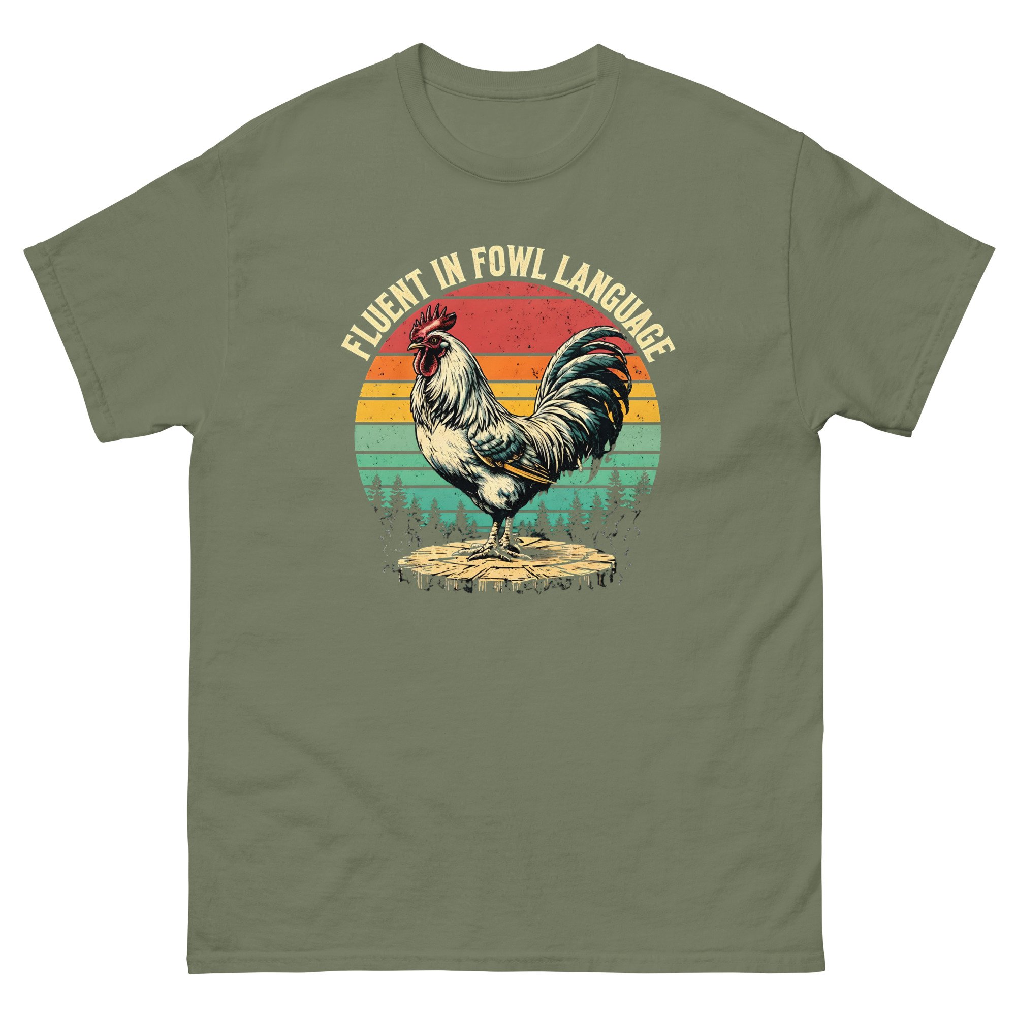 Funny Chicken Graphic Tee, Rooster Farm Humor T-Shirt, Country Humor Chicken Shirt, Funny chicken shirt featuring a detailed rooster set against a retro sunset background with the phrase “Fluent in Fowl Language.” This playful design combines farm life humor with vintage-inspired style, making it perfect for chicken owners, homesteaders, and anyone who enjoys country living with a sense of humor. The bold imagery and warm retro colors create a standout look that feels both nostalgic and fun, while the clever wordplay adds personality and charm. Ideal for everyday wear, farm life, or as a unique gift for animal lovers and rural lifestyle enthusiasts.