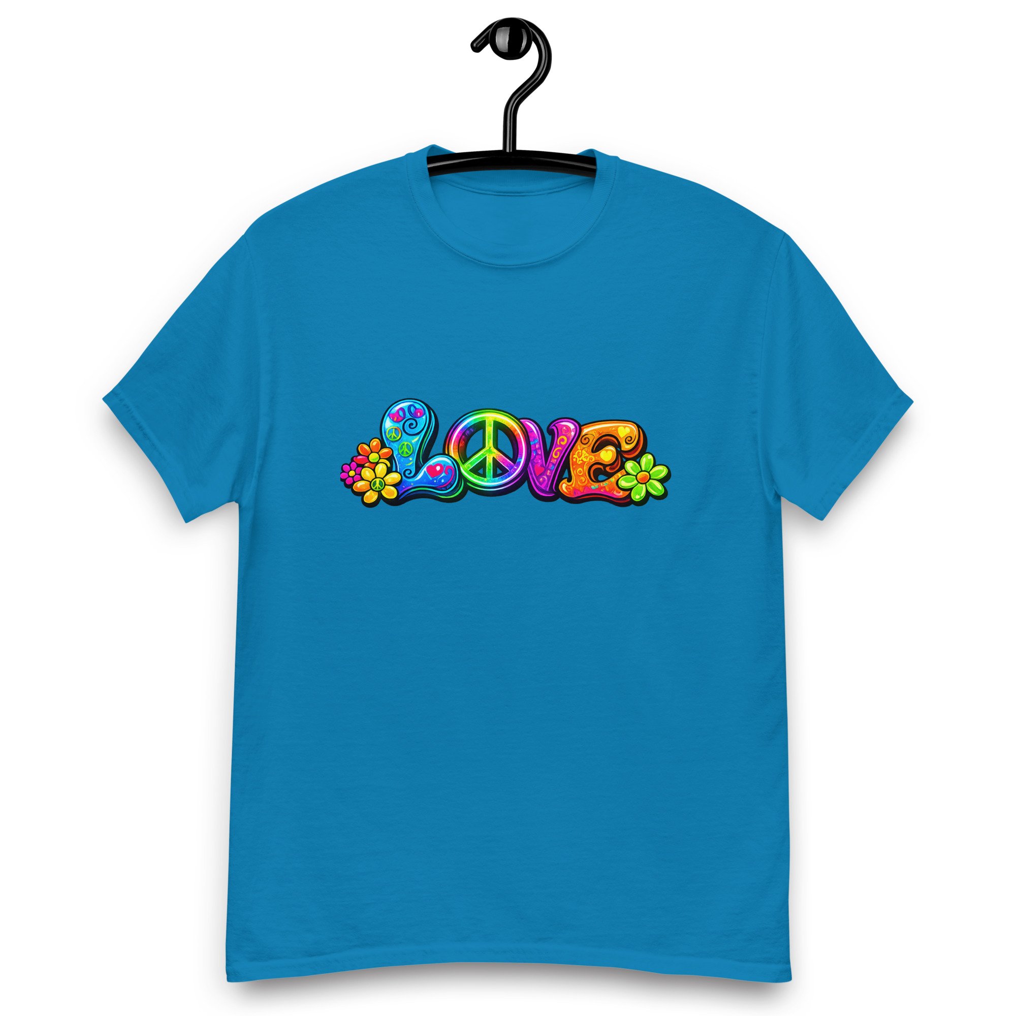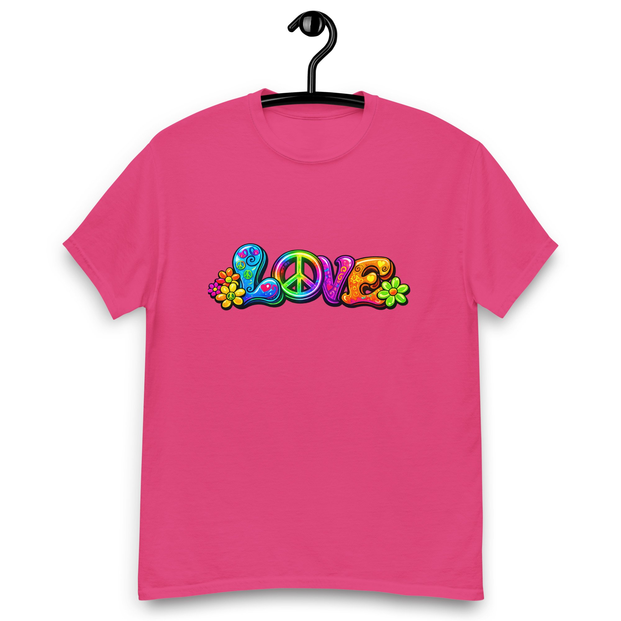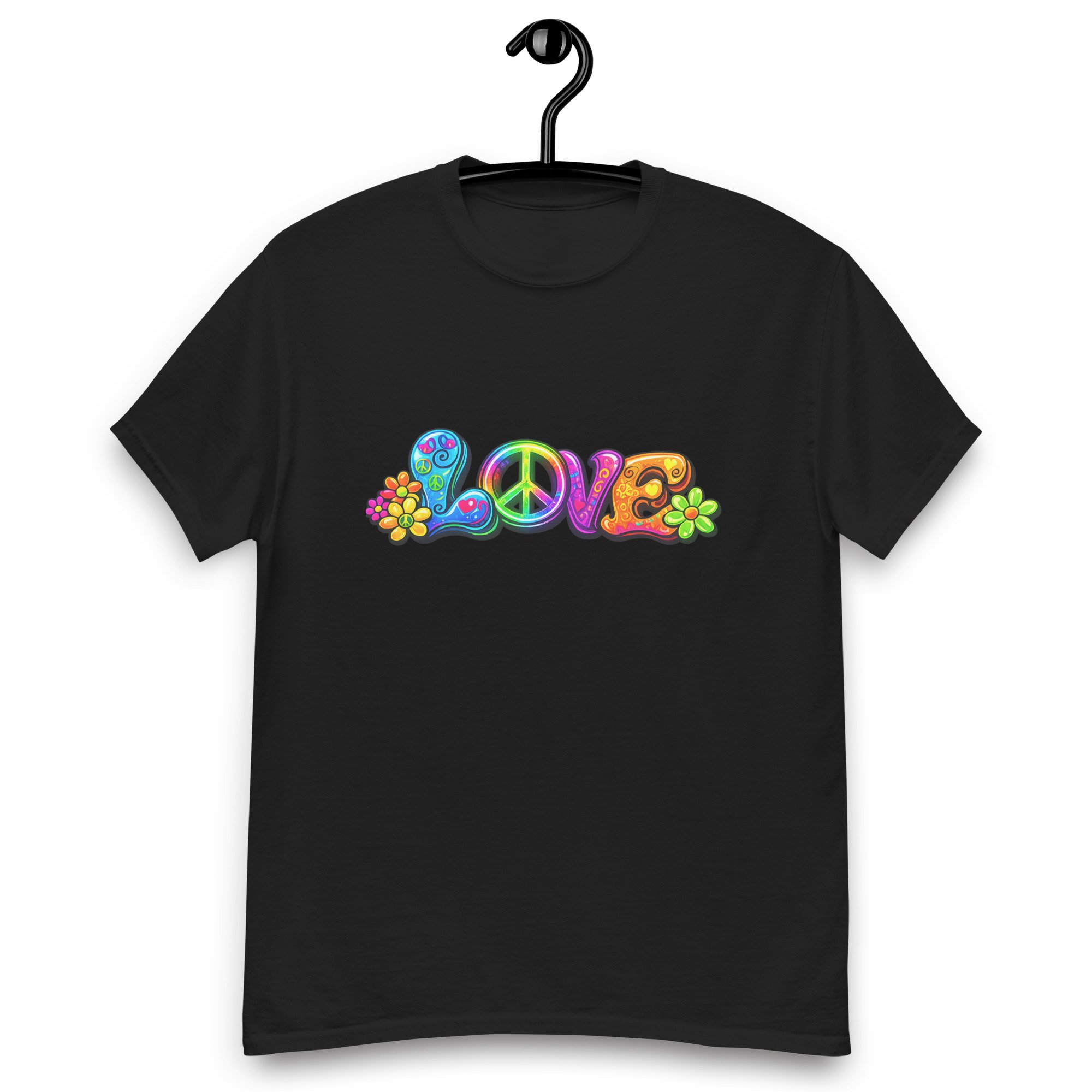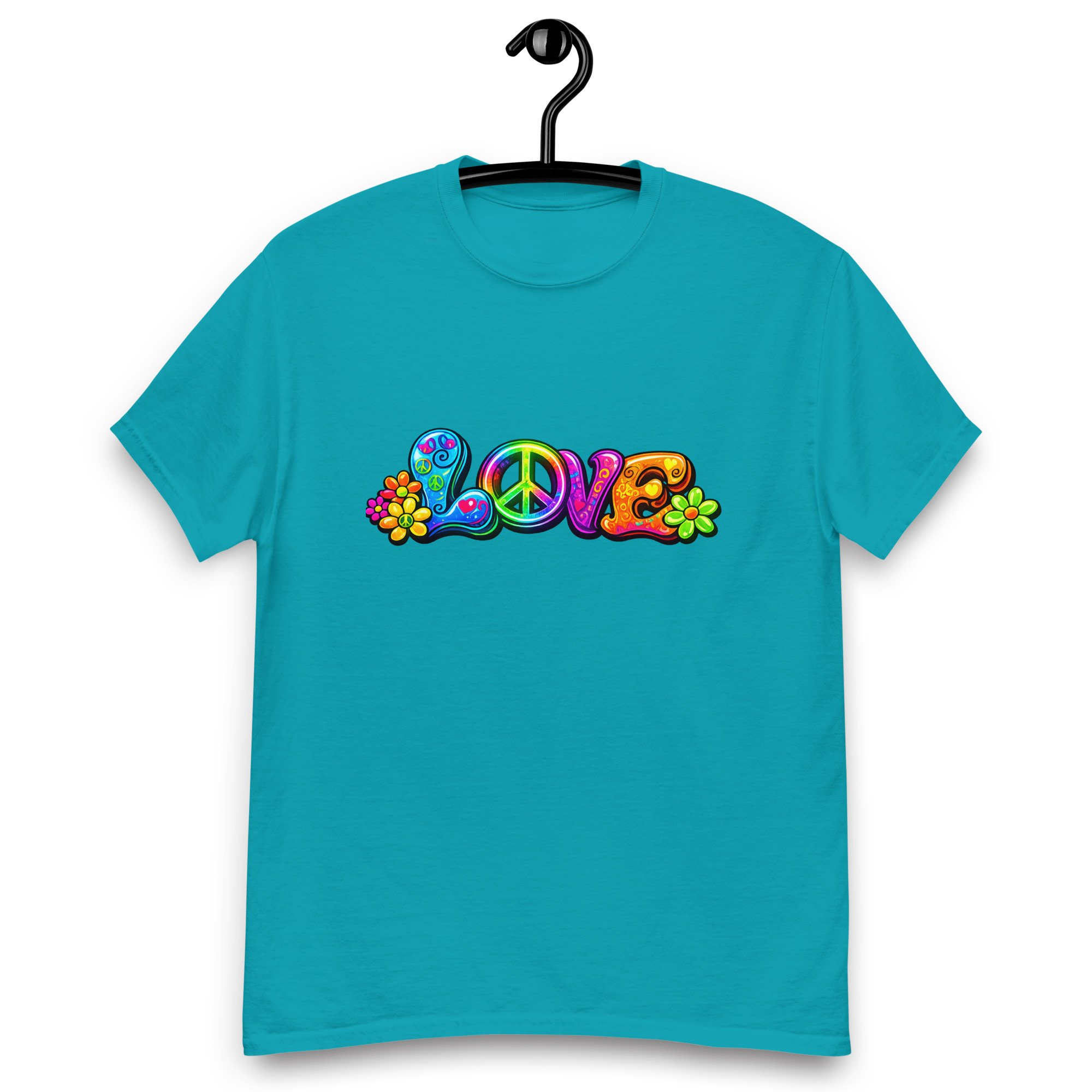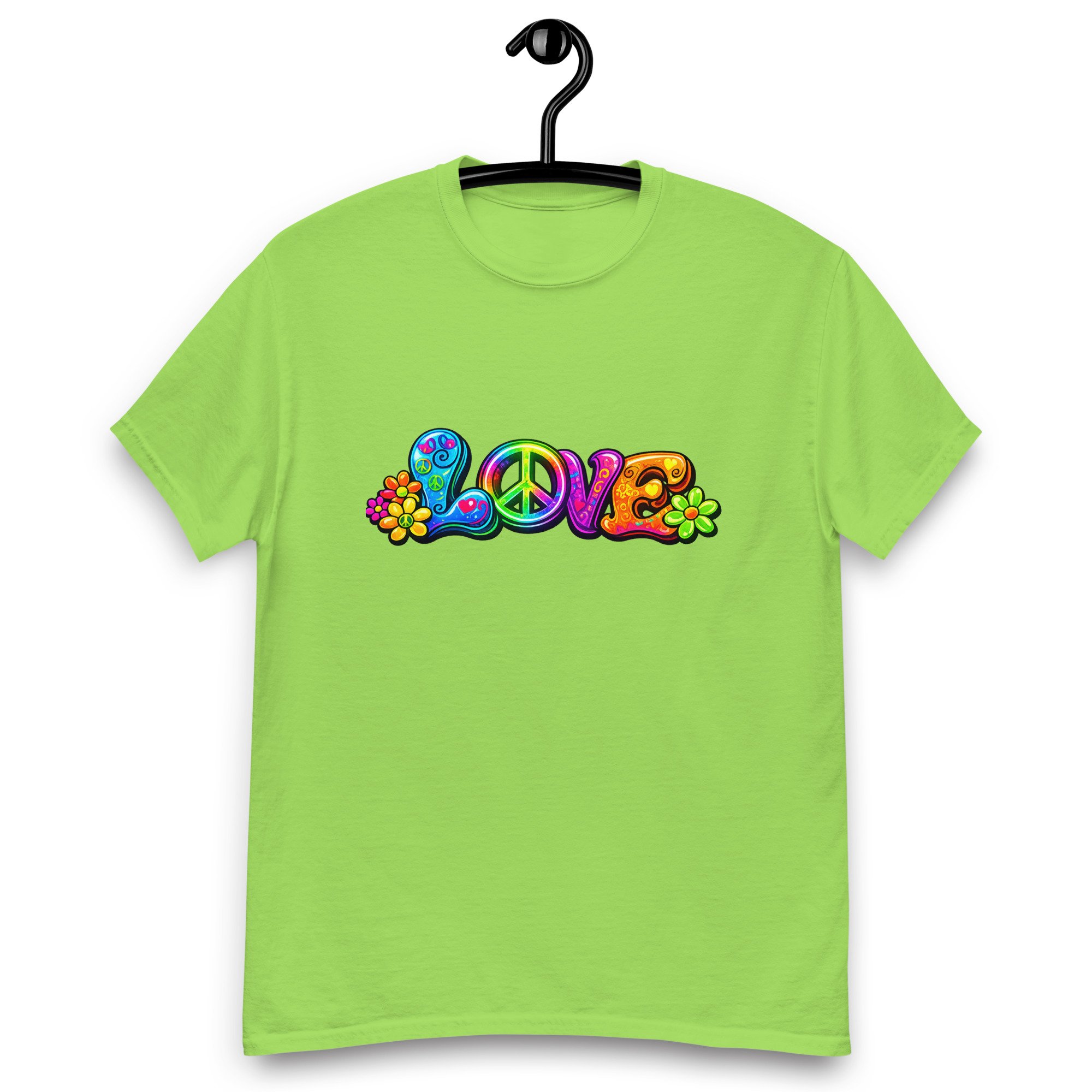 LOVE, PEACE & FLOWERS is a bold and colorful design that captures the spirit of peace, positivity, and retro style. With vibrant lettering, playful floral details, and a classic peace symbol, this graphic tee brings a feel-good message to everyday wear.