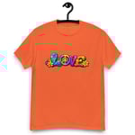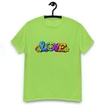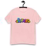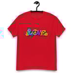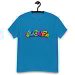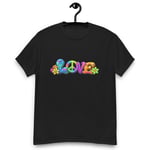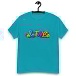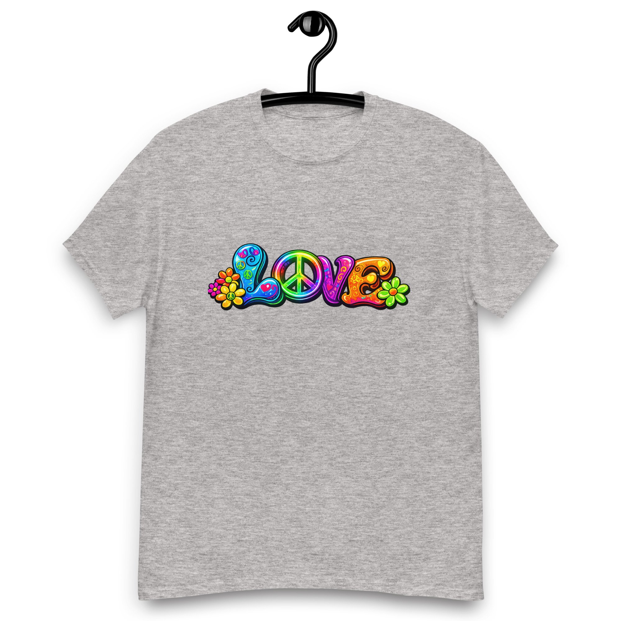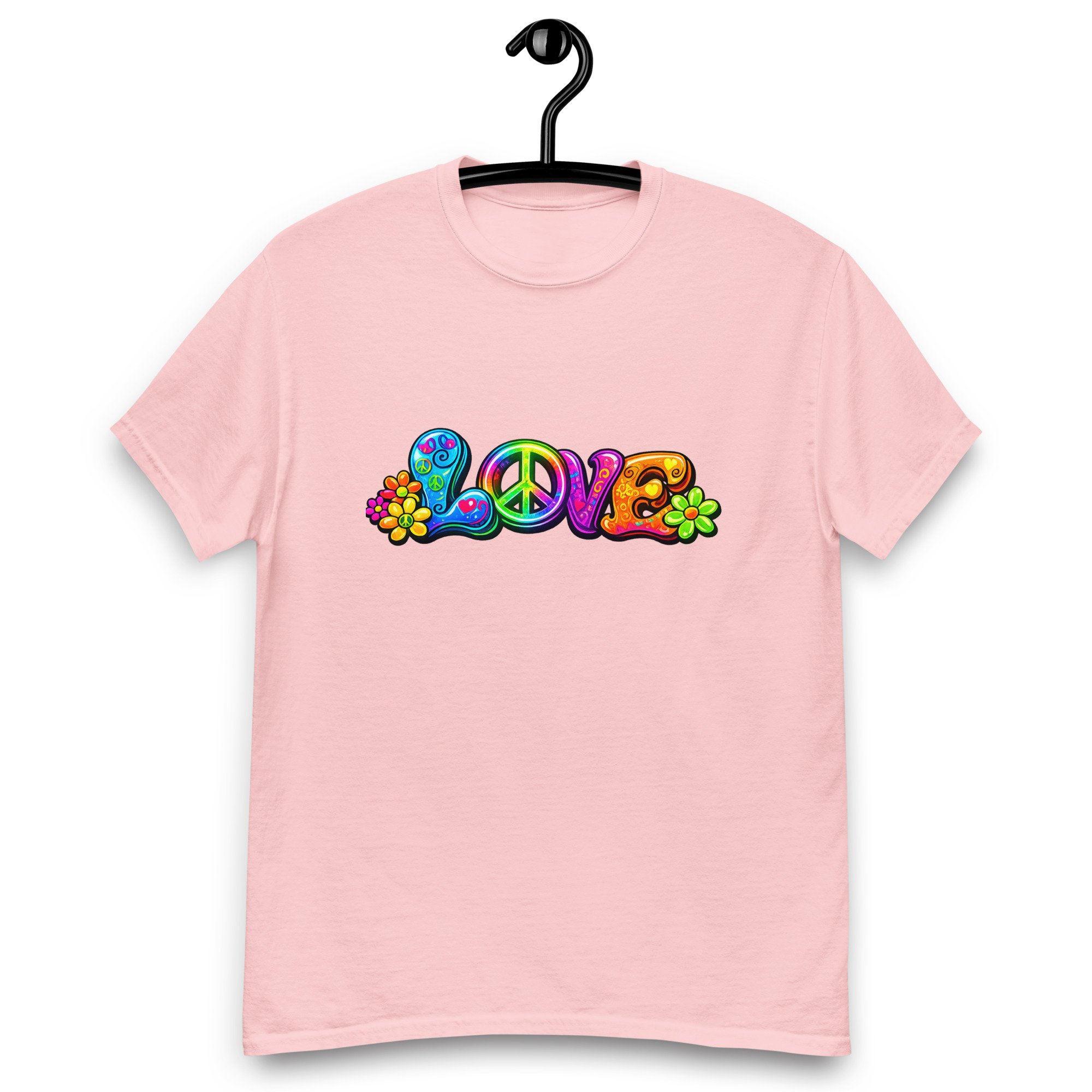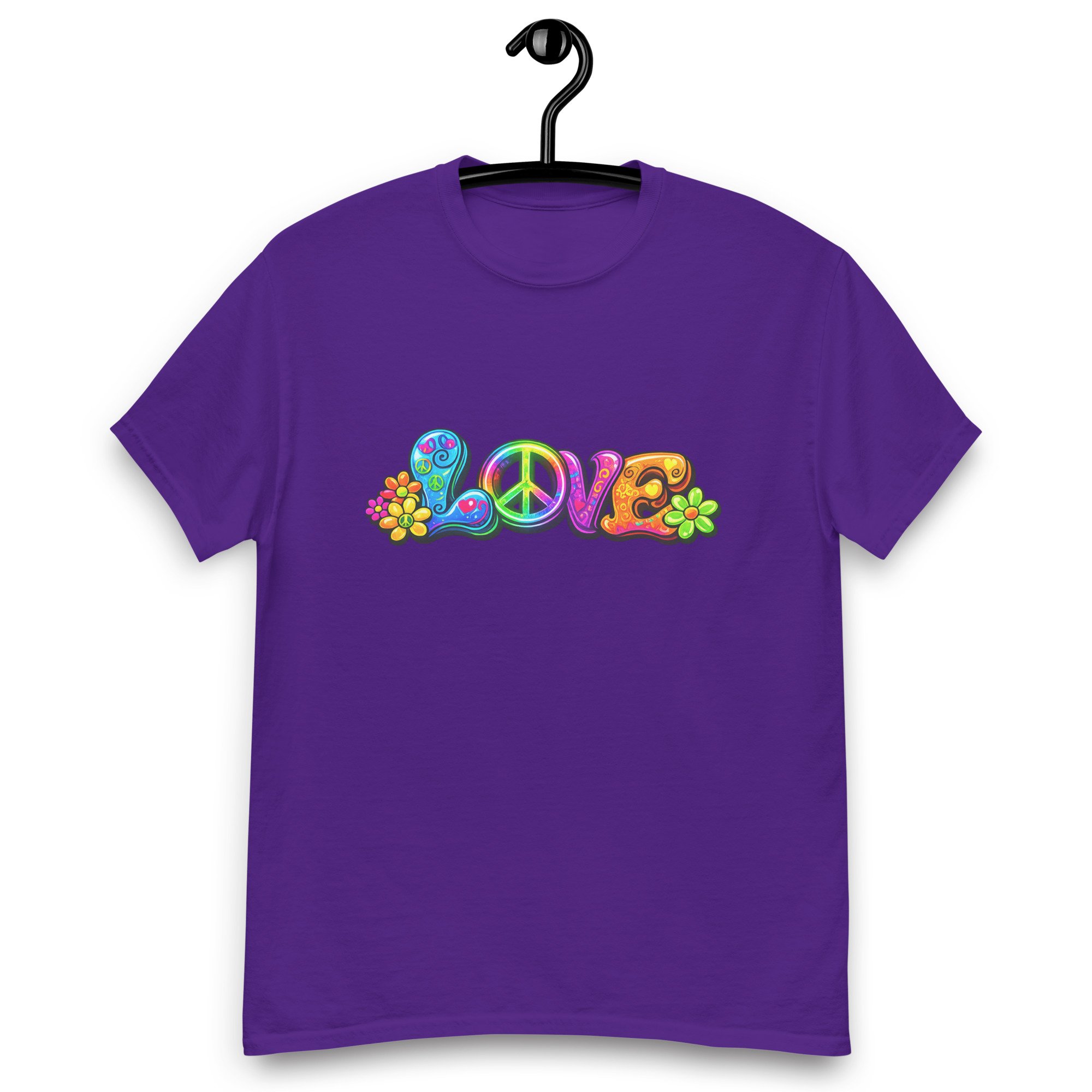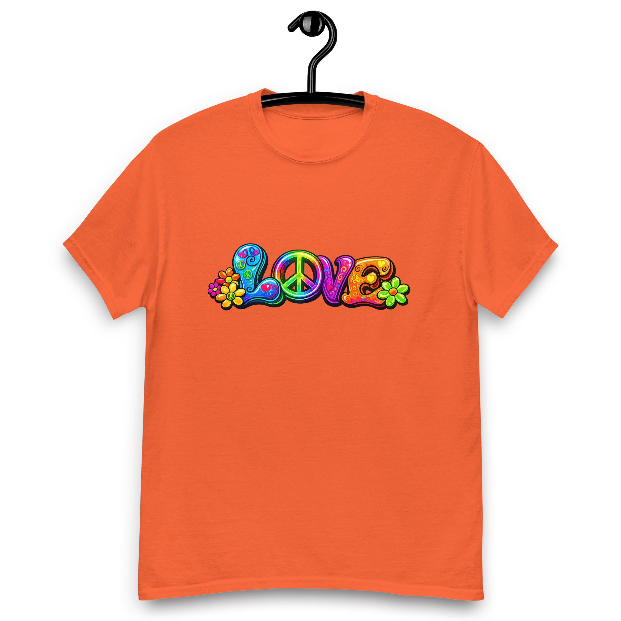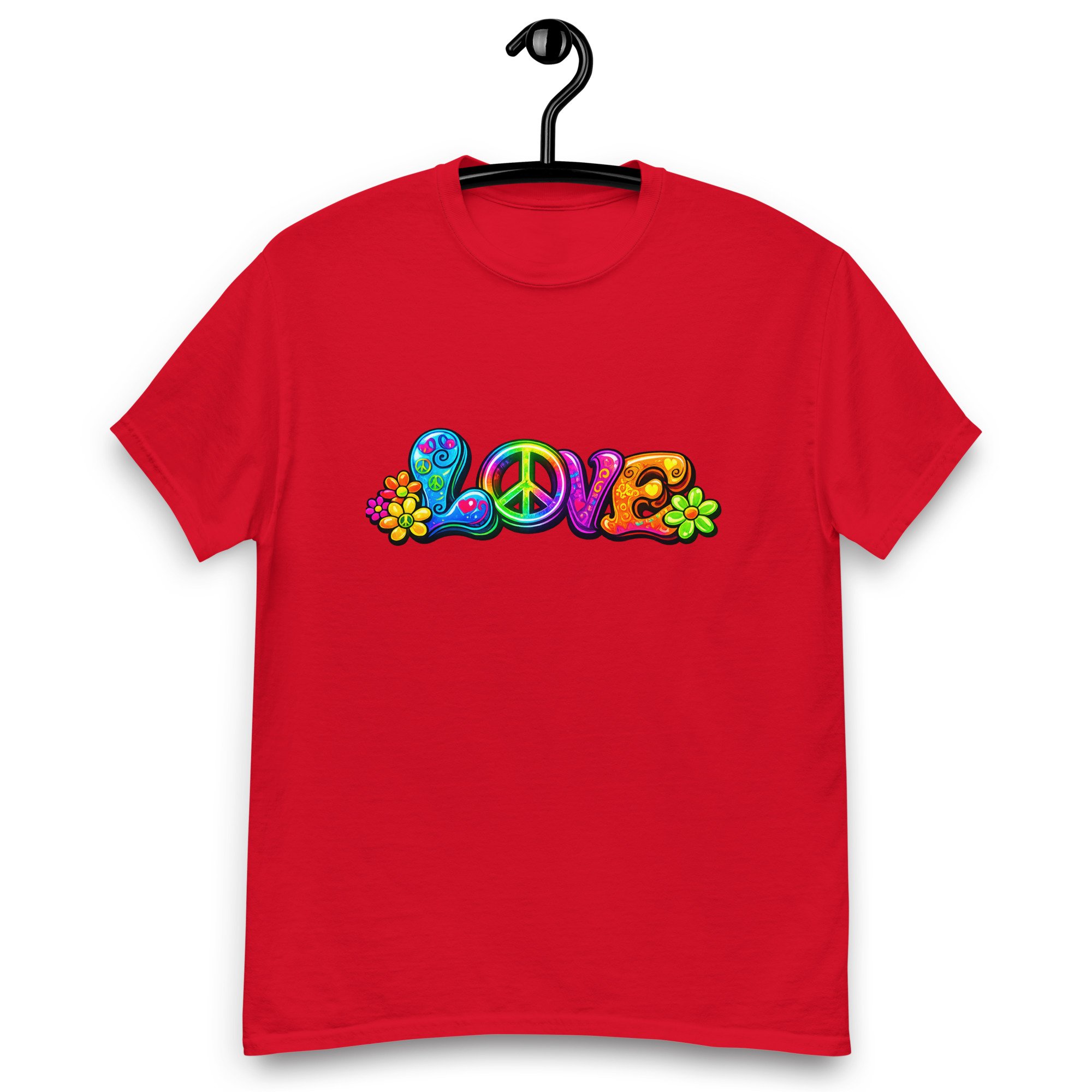 LOVE, PEACE & FLOWERS is a bold and colorful design that captures the spirit of peace, positivity, and retro style. With vibrant lettering, playful floral details, and a classic peace symbol, this graphic tee brings a feel-good message to everyday wear.