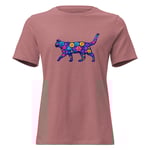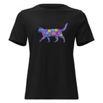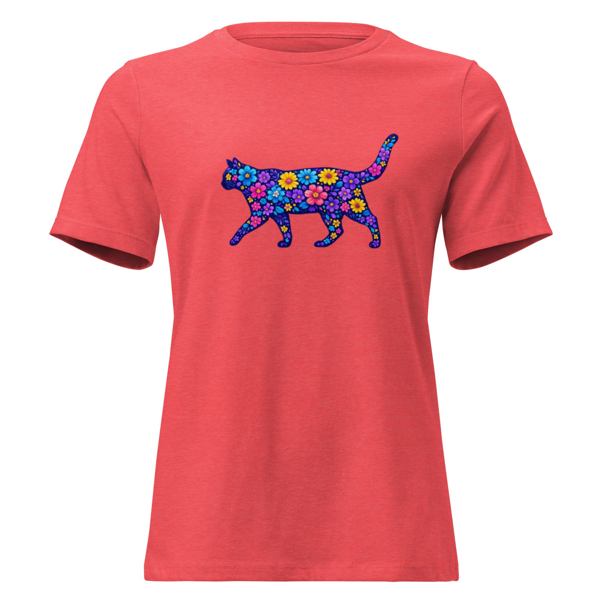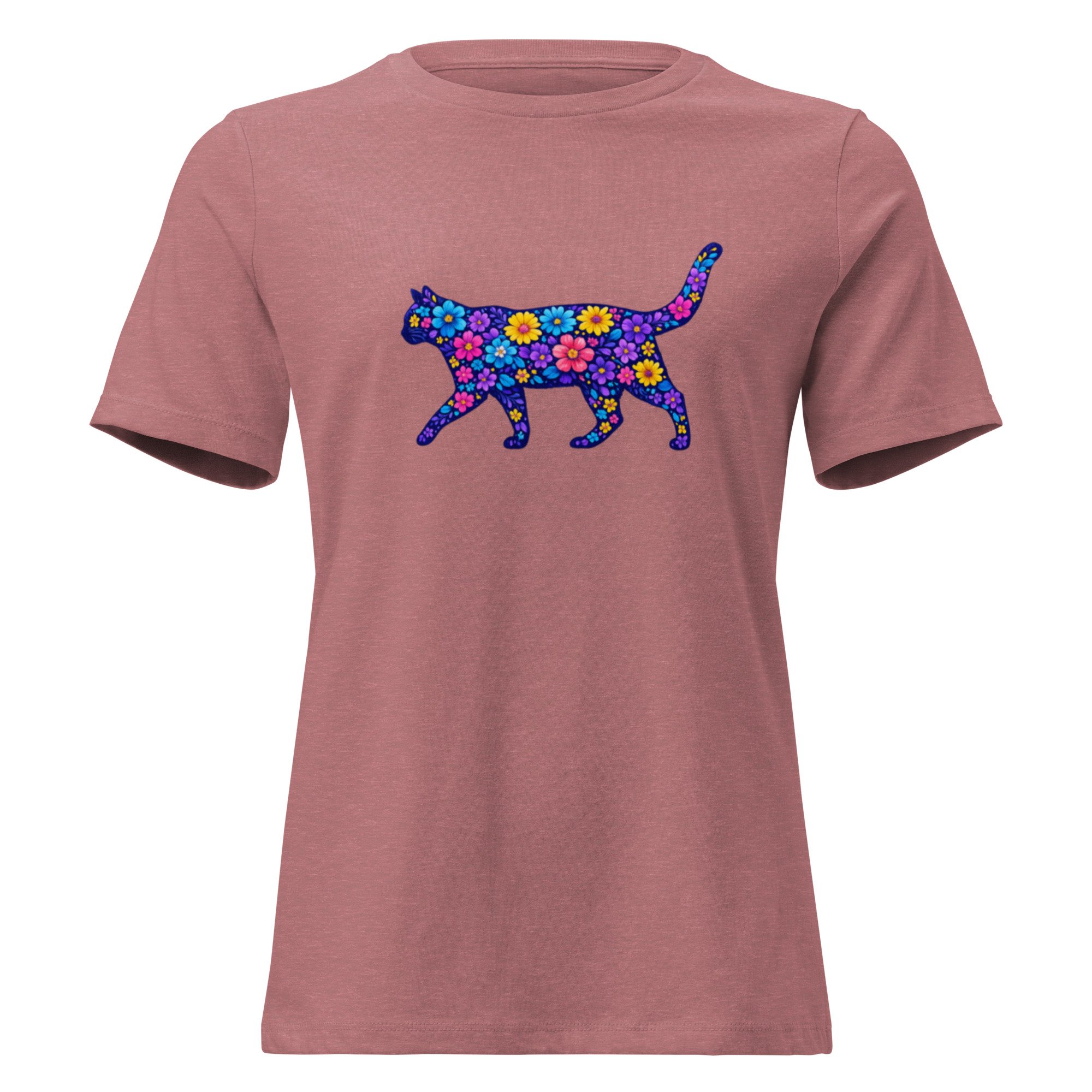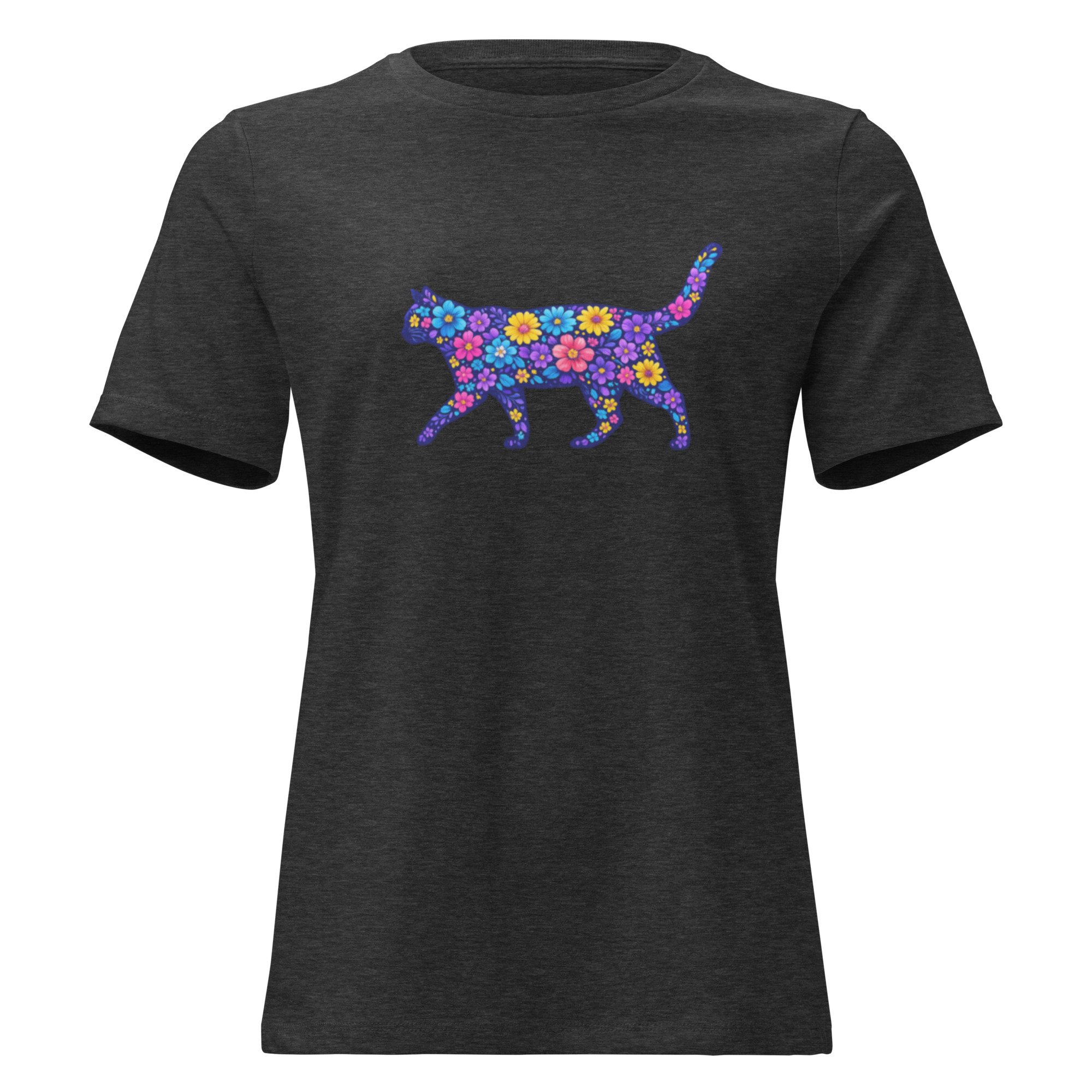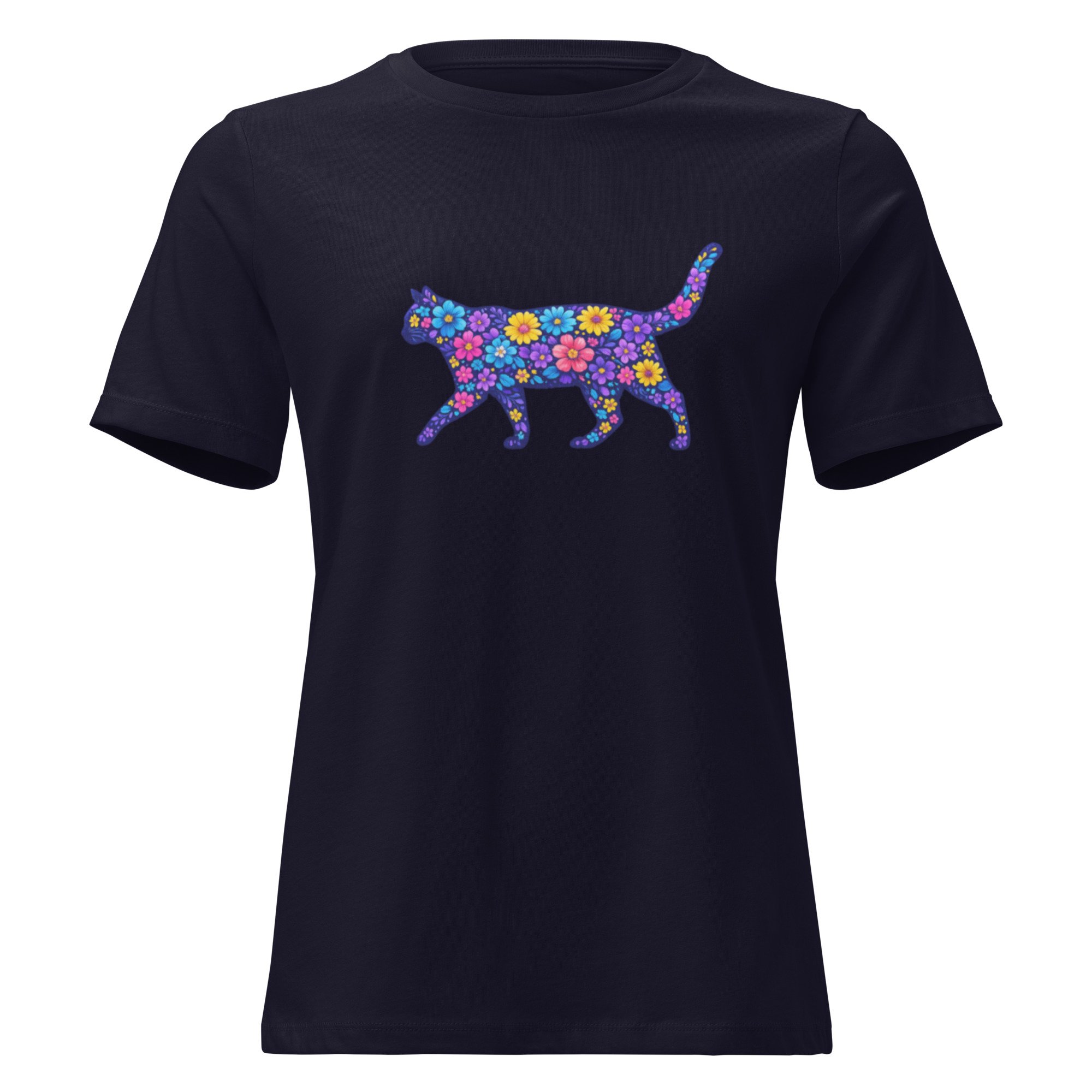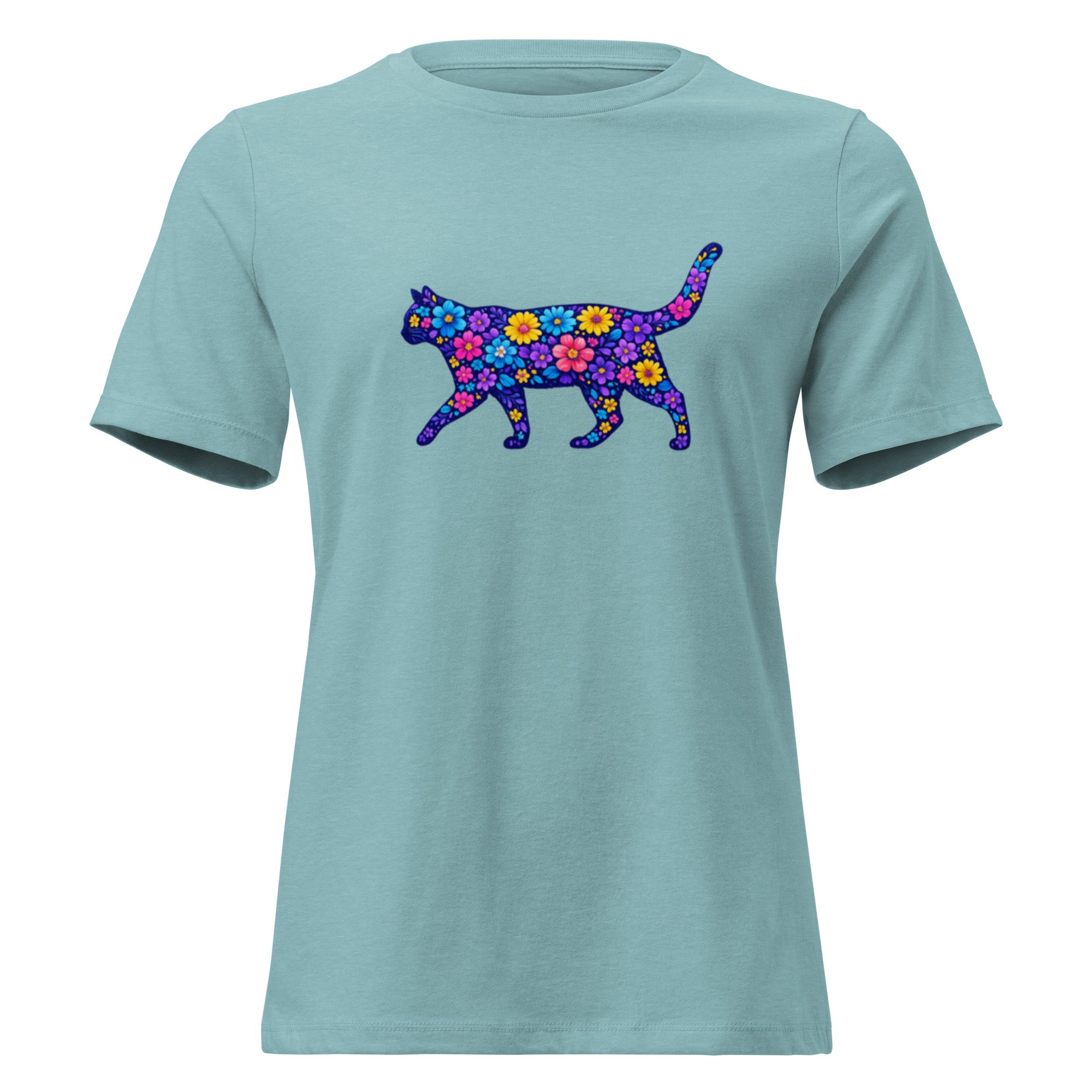 Women's Relaxed T-Shirt, Blue Floral Cat T-Shirt | Colorful Artistic Cat Graphic Tee