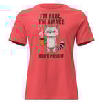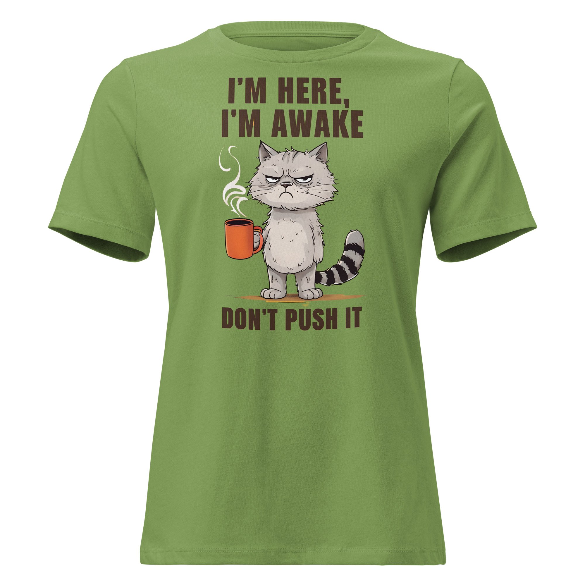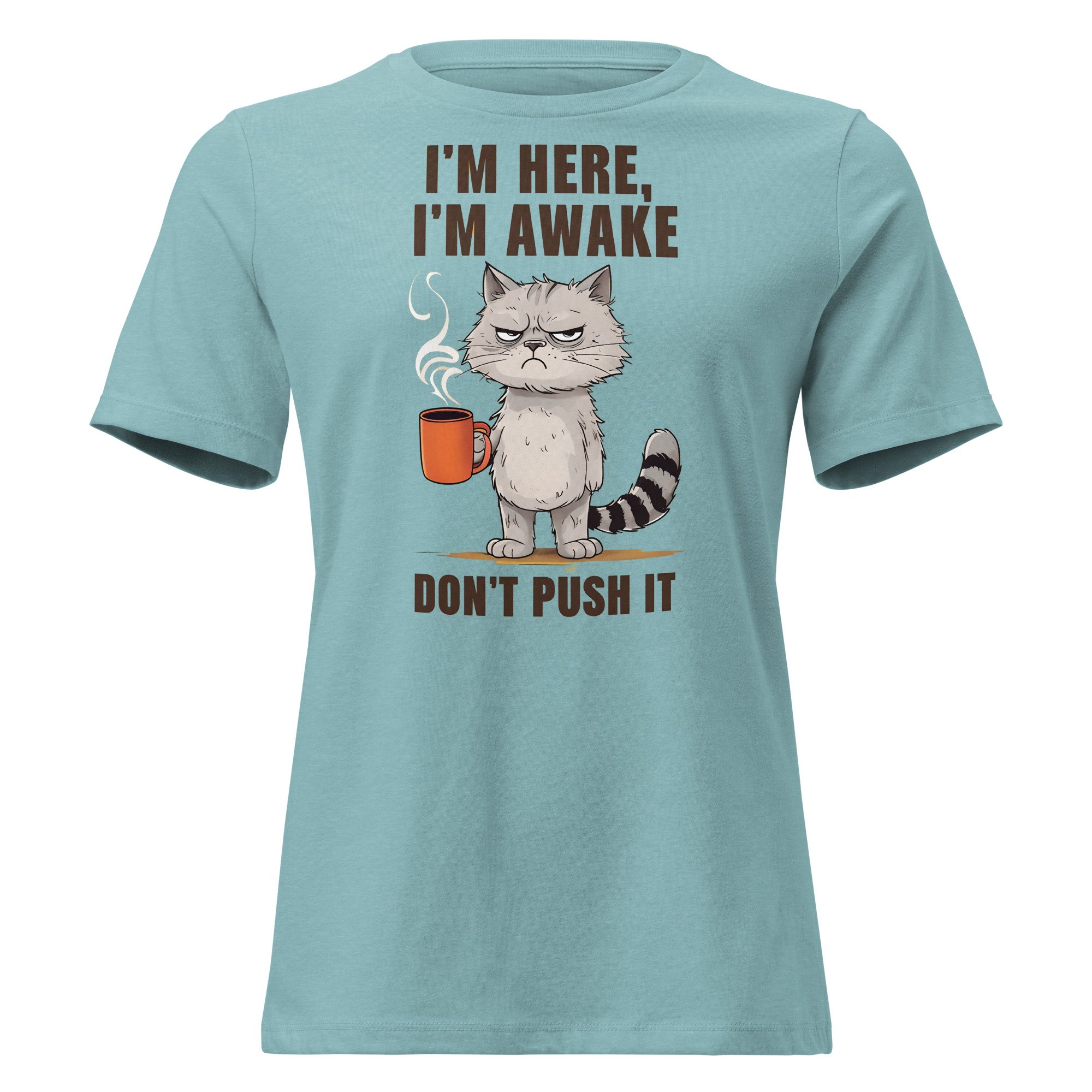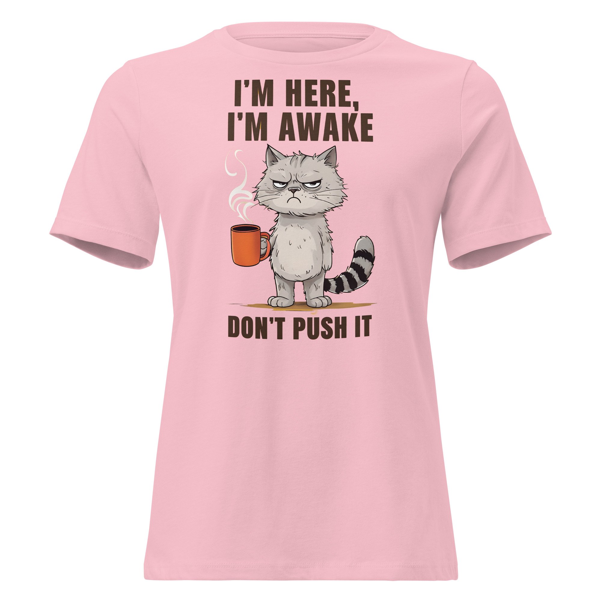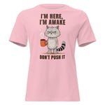 Women's Relaxed T-Shirt, I'm Here I'm Awake Don't Push It T-Shirt | Funny Grumpy Cat Coffee Tee