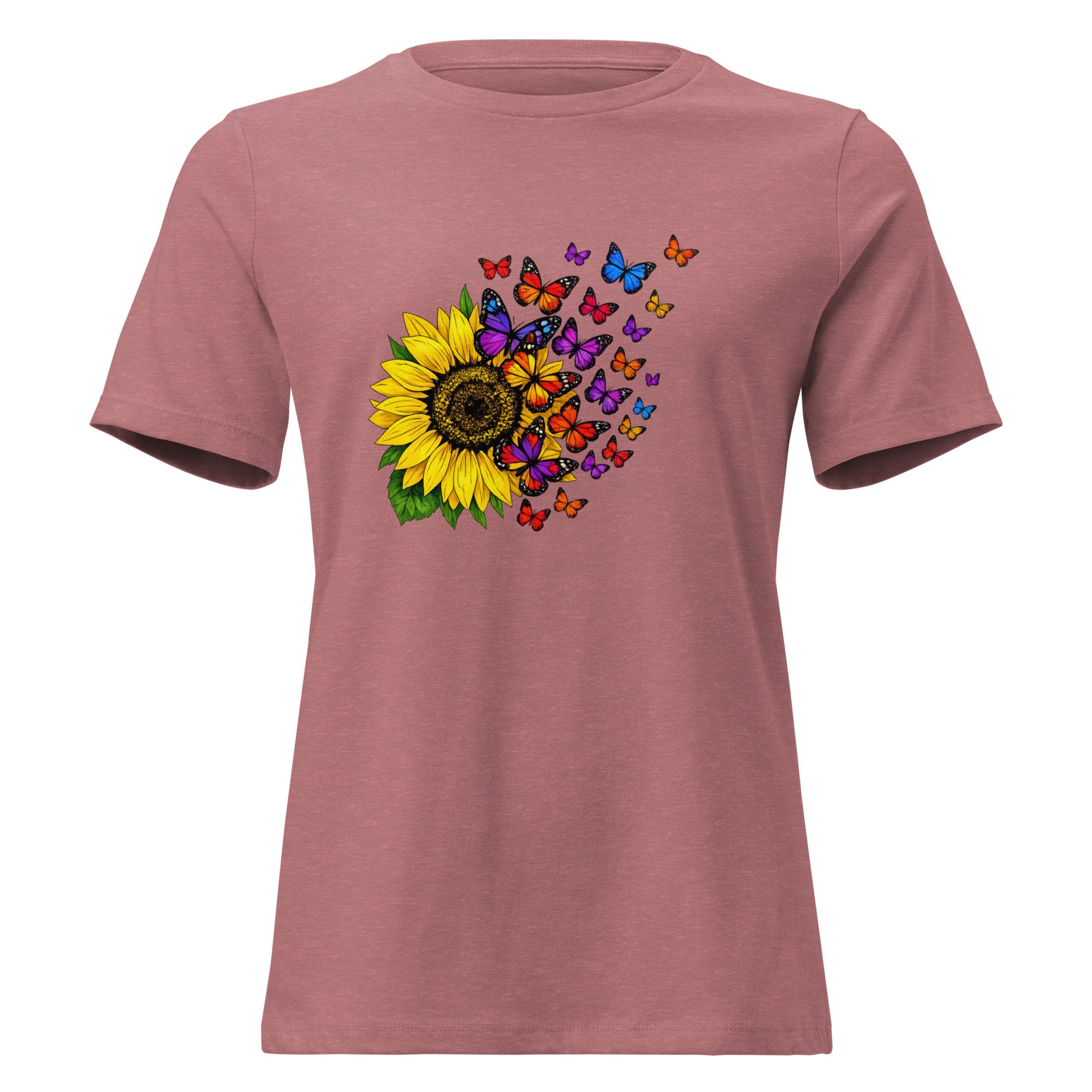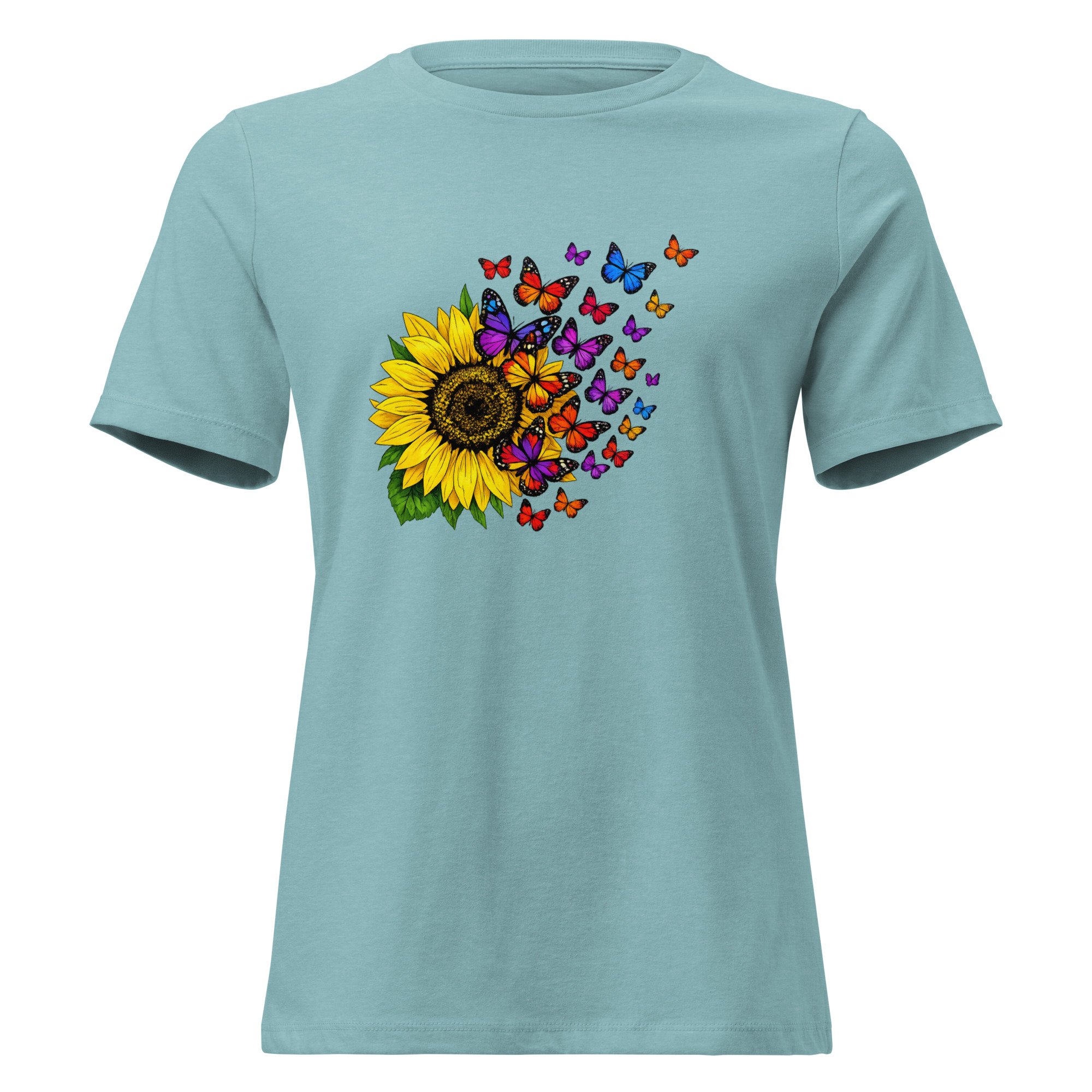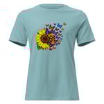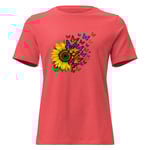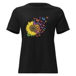 Sunflower & Butterfly Graphic Women's Tee, Floral Butterfly T-Shirt, Colorful Nature Art Shirt, Petals & Painted Wings features a vibrant sunflower paired with a cascade of colorful butterflies, creating a beautiful sense of movement, transformation, and natural beauty.