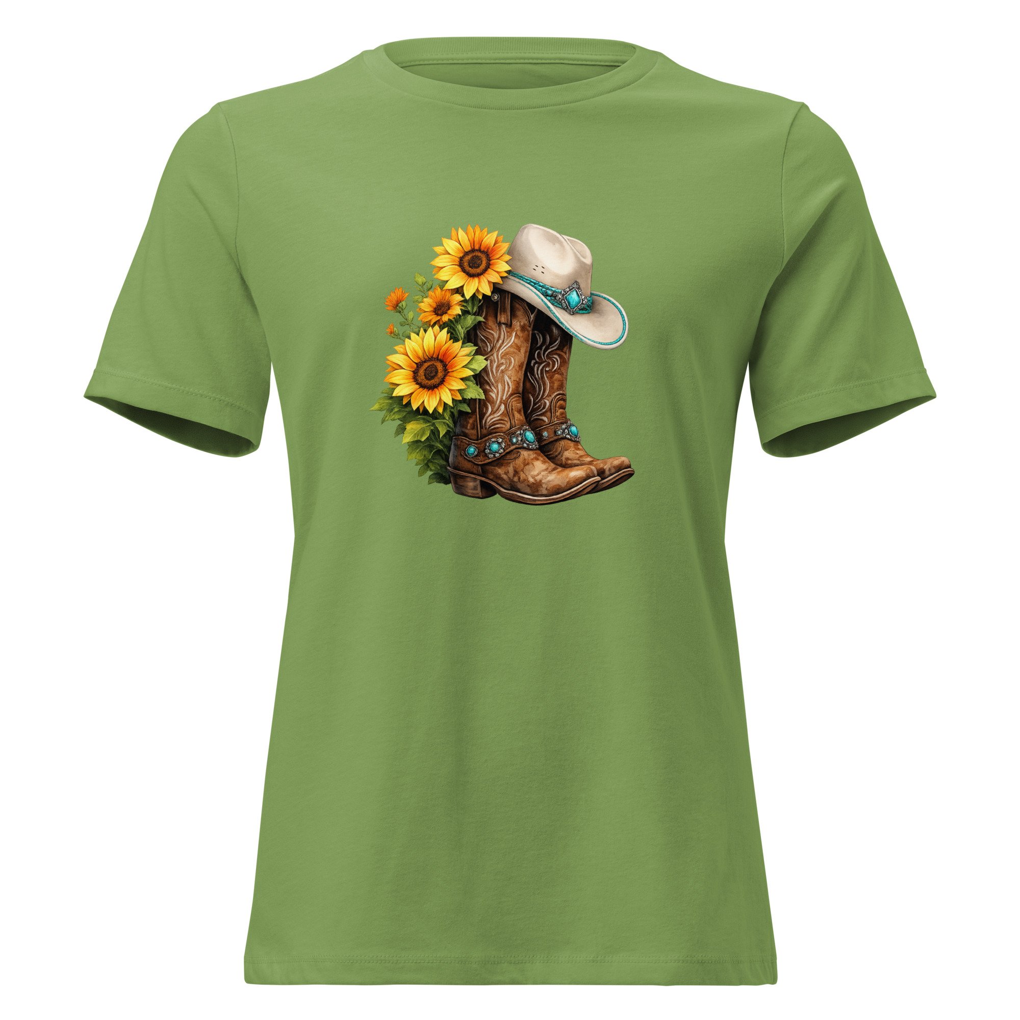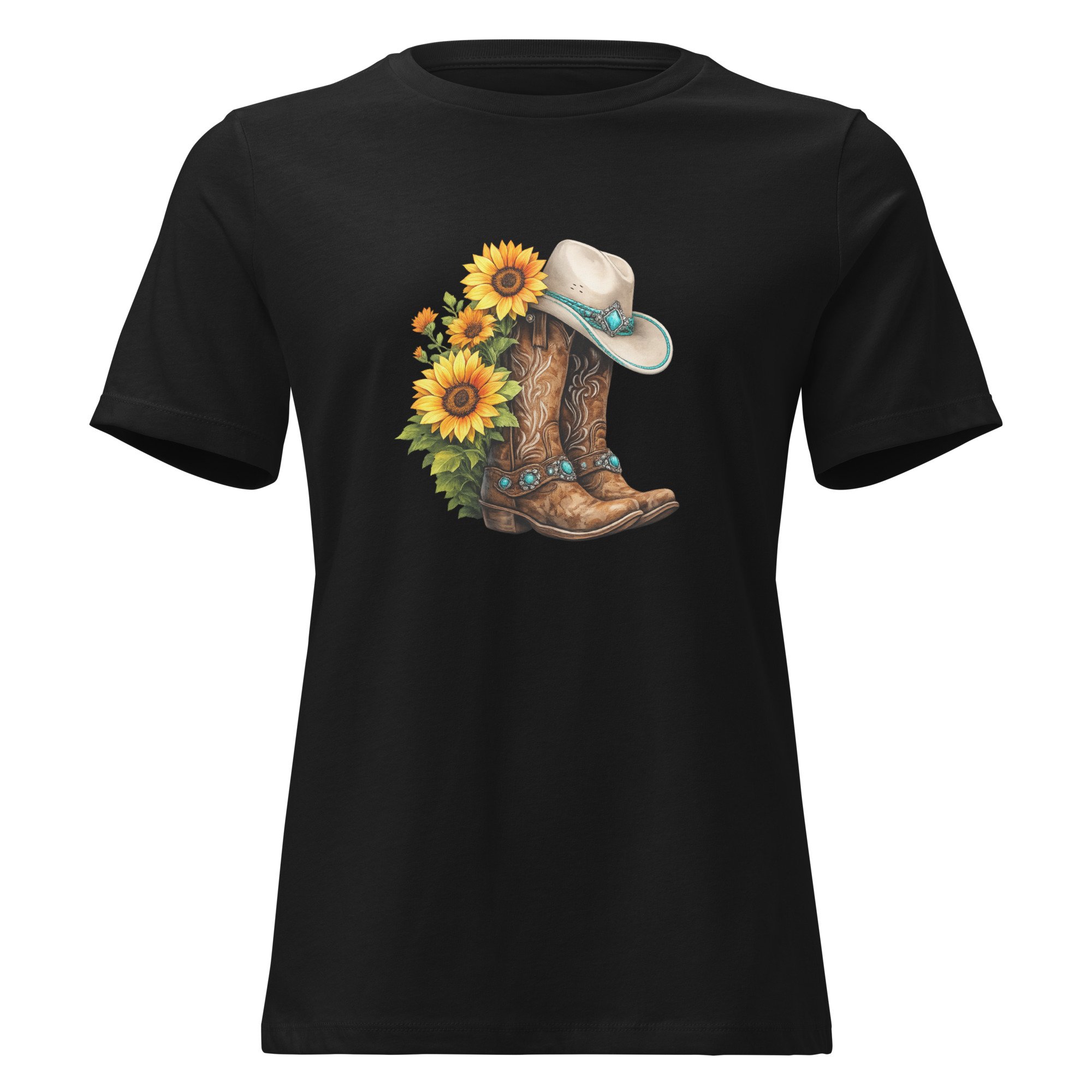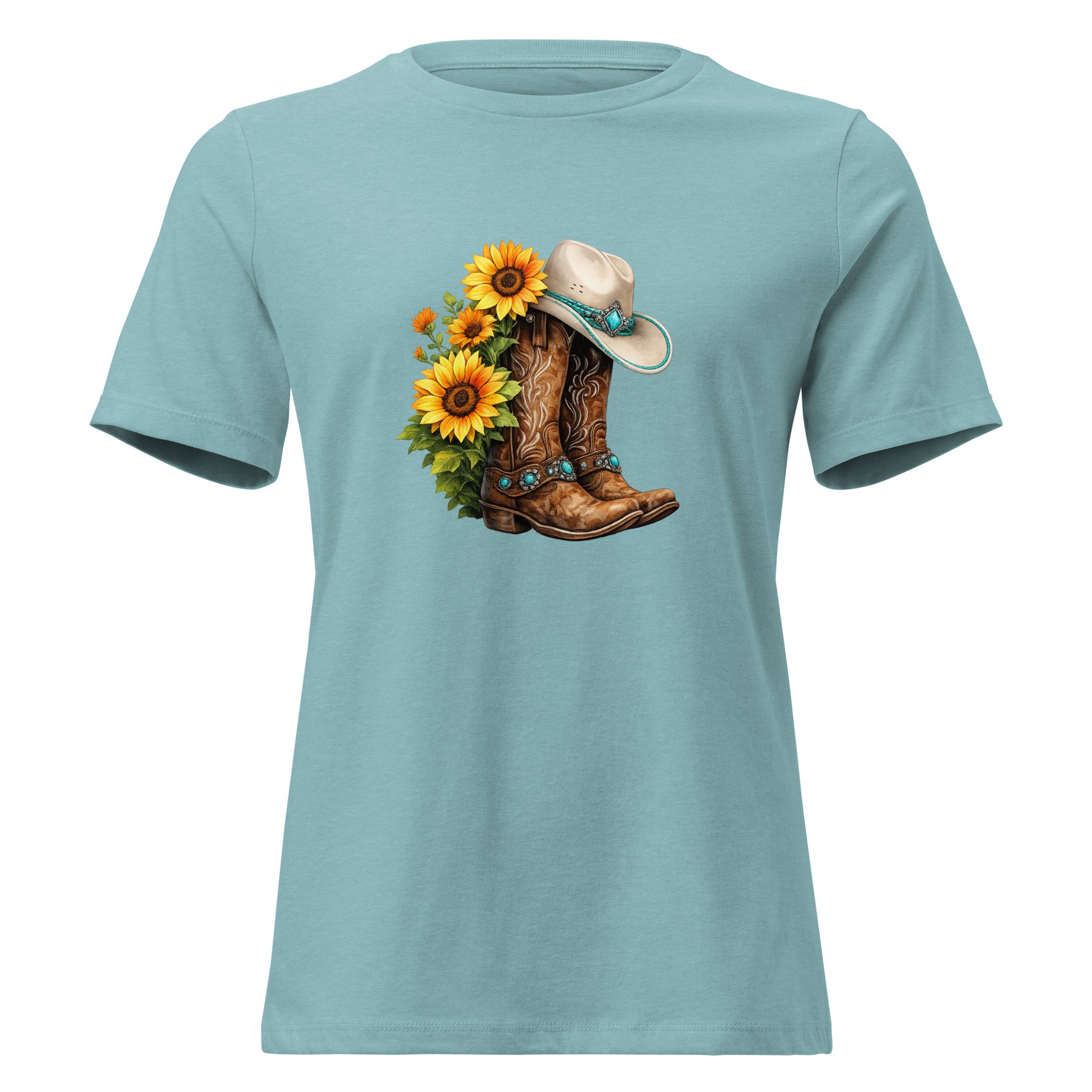 Women's Relaxed T-Shirt, Turquoise Sunflower Cowgirl Boots Tee