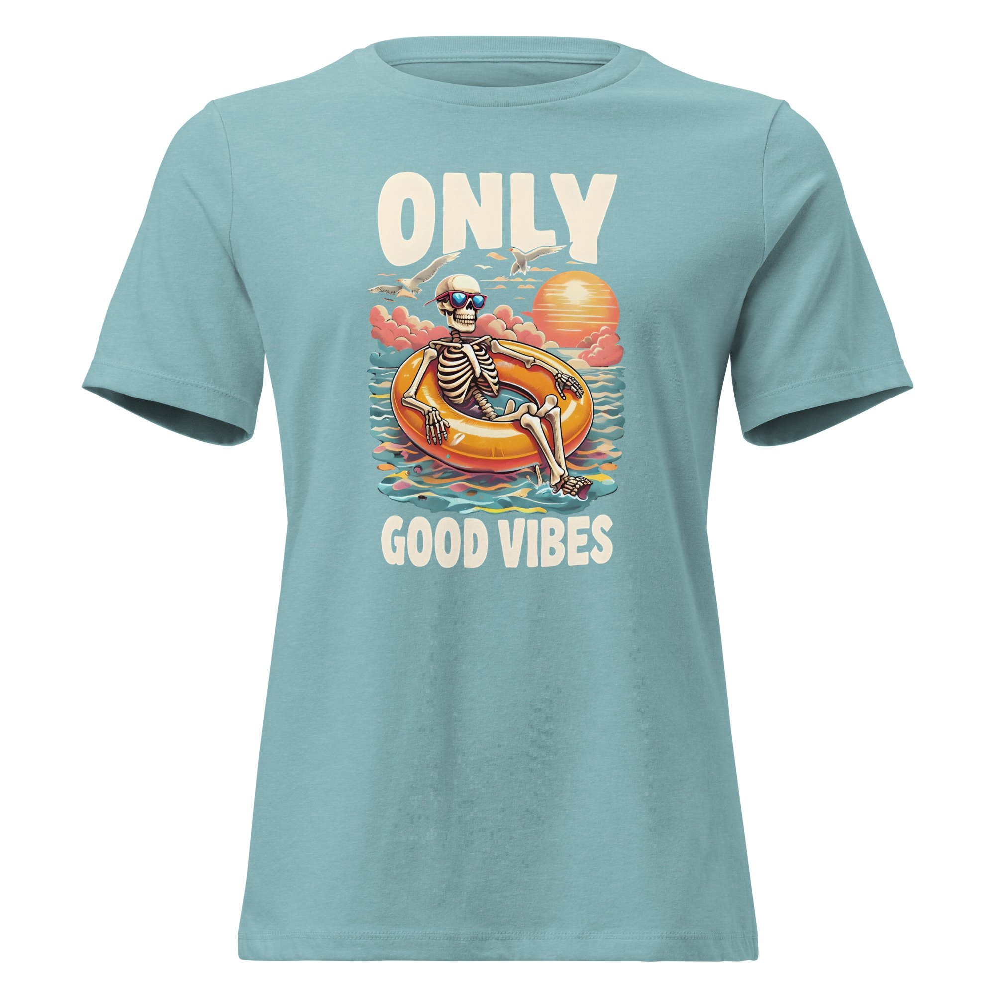 Only Good Vibes brings laid-back humor to life with a relaxed skeleton floating in the water, soaking up the sun and enjoying the moment. With retro-inspired beach tones and a carefree attitude, this design captures the ultimate chill mindset.