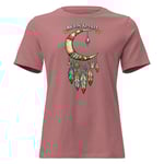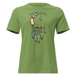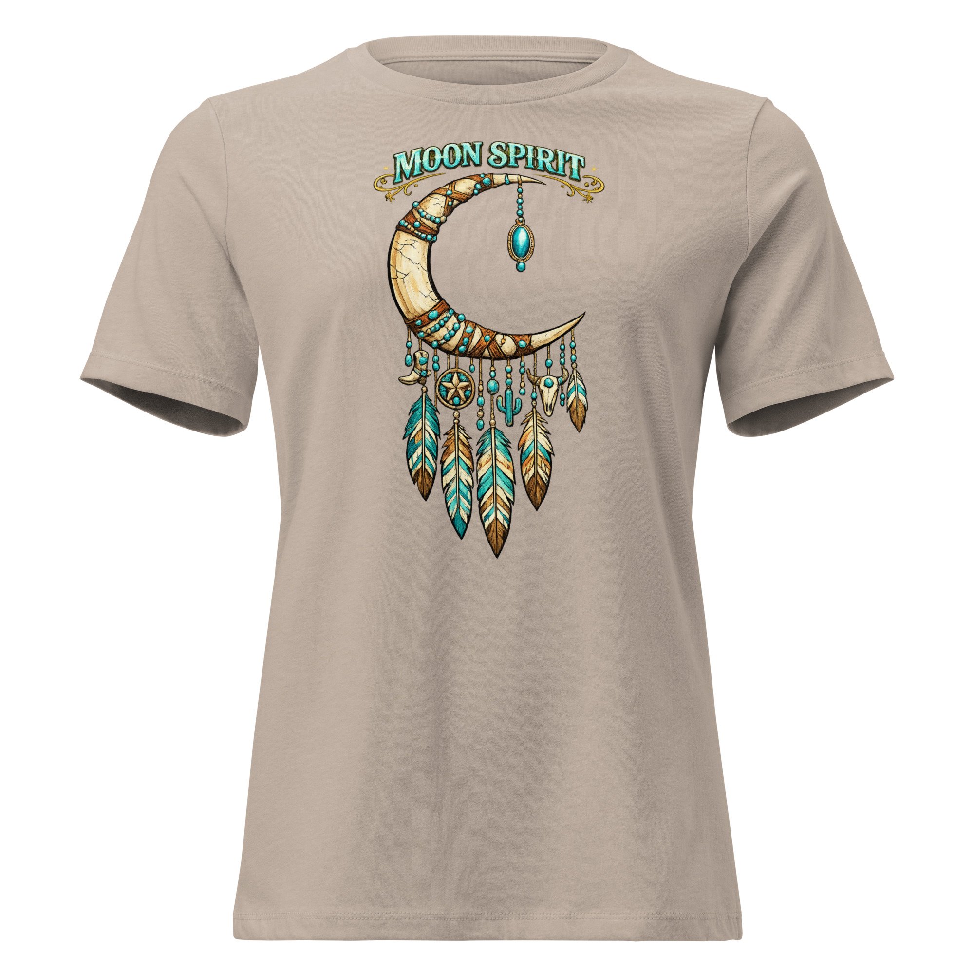Embrace your western spirit with this Moon Spirit Cowgirl women’s tee, featuring a glowing crescent moon adorned with turquoise stones, feathers, rawhide and Southwest-inspired charms.